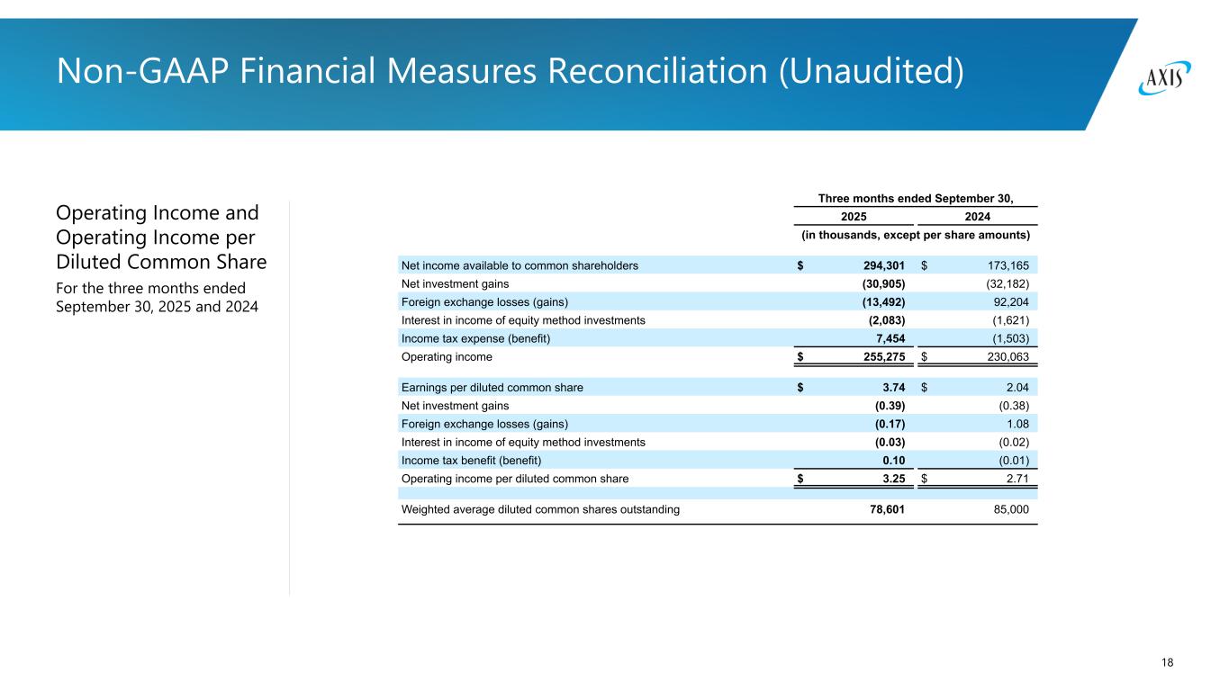 17截至2025年9月30日止九个月及截至2024年12月31日、2023年和2022年12月31日止年度的营业收入和平均普通股权益营业回报率(1)递延税项收益净额是由于确认递延税项资产扣除与百慕大公司所得税相关的递延税项负债,该递延税项负债自2025年1月1日或之后开始的财政年度生效。(2)与普通股股东可得(应占)净收益(亏损)调整相关的税务费用(收益)。税收影响是通过应用适用司法管辖区的法定税率来估算的。Non-GAAP财务指标调节(未经审计)截至9月30日的九个月,截至2025年12月31日的年度202420232022(单位:千,除每股金额外)普通股股东可获得的净收入696,601美元1,051,536美元346,042美元192,833净投资(收益)损失(44,365)138,53474,630456,789外汇损失(收益)138,428(50,822)58,115(157,945)重组费用— 26,31228,99731,426权益法投资收益中的利息(3,669)(17,953)(4,163)(1,995)百慕大递延所得税资产净额(1)—(176,923)——所得税收益(2)(12,330)(18,649)(17,488)(23,177)营业收入774,665美元952,035美元486,133美元497,931美元平均普通股权益经营回报率18.2% 18.6% 11.0% 11.1%