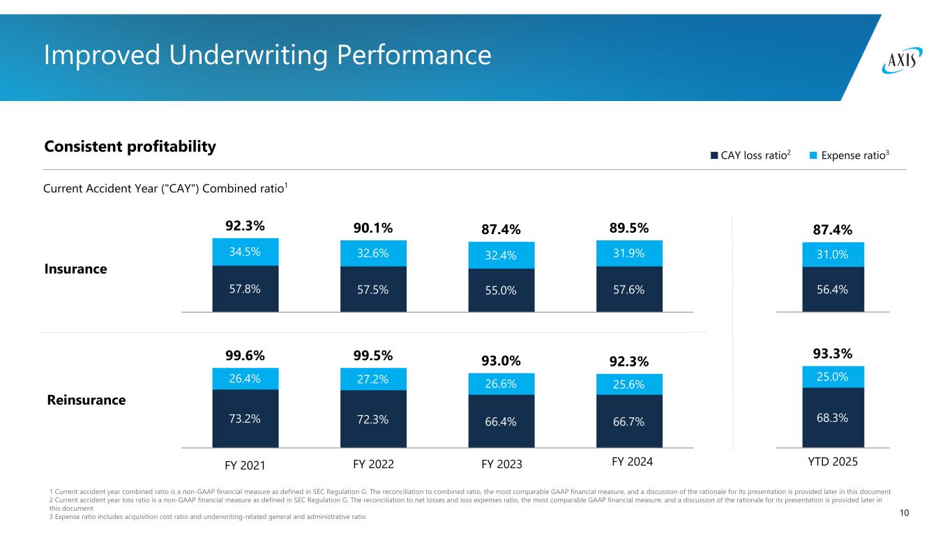 1099.6% 99.5% 93.0% 92.3% 73.2% 72.3% 66.4% 66.7% 26.4% 27.2% 26.6% 25.6% 92.3% 90.1% 87.4% 89.5% 57.8% 57.5% 55.0% 57.6% 34.5% 32.6% 32.4% 31.9% 1当前事故年度合并比率是SEC条例G中定义的非GAAP财务指标。与合并比率的调节,最具可比性的GAAP财务指标,以及对其列报理由的讨论将在本文件后面部分提供2当前事故年度损失率是SEC条例G中定义的非GAAP财务指标。与净损失和损失费用比率的调节,最具可比性的GAAP财务指标,本文件后面部分将讨论其列报的基本原理3费用比率包括购置成本率和与承保相关的一般和行政比率改善的承保业绩一致盈利能力当前事故年(“CAY”)综合比率1 CAY损失率2费用比率3保险再保险93.3% 68.3% 25.0% 87.4% 56.4% 31.0% FY 2021 FY 2022 FY 2023 FY 2024 YTD 2025