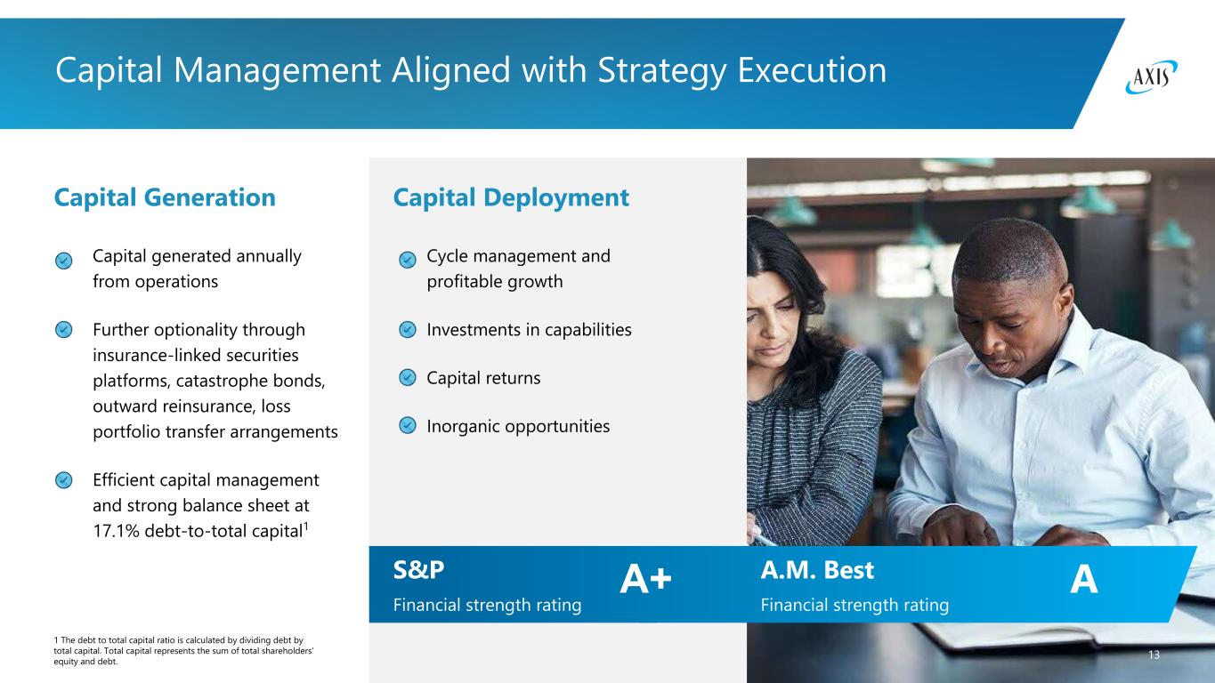 上午13日最佳财务实力评级AS & P财务实力评级A +资本管理与战略执行保持一致资本部署周期管理和盈利增长对能力的投资资本回报无机机会资本生成资本每年从运营中产生的进一步选择性通过与保险挂钩的证券平台、巨灾债券、向外再保险、损失投资组合转移安排高效的资本管理和强大的资产负债表,债务与总资本比率为17.1% 1债务与总资本比率的计算方法是债务除以总资本。资本总额表示股东权益和债务总额之和。
