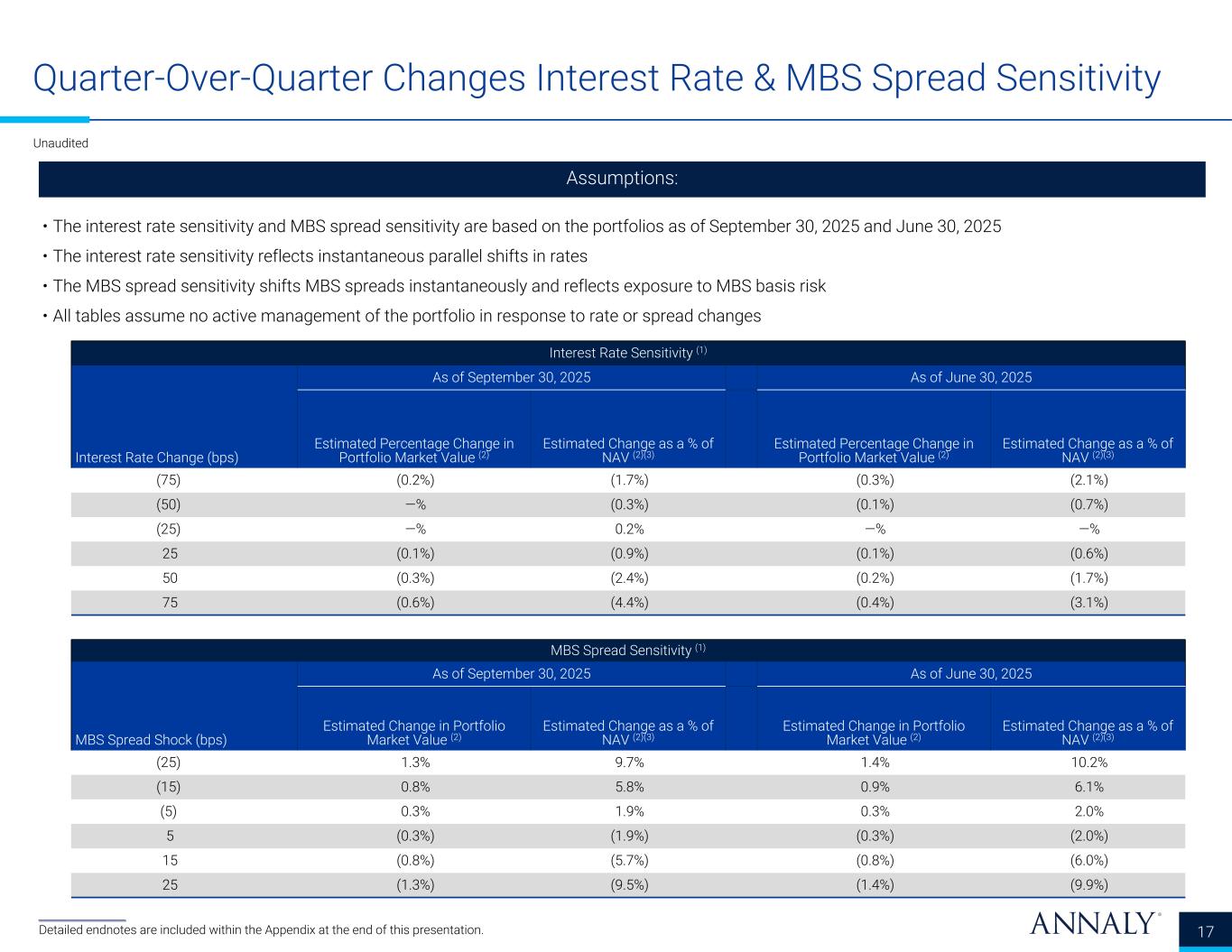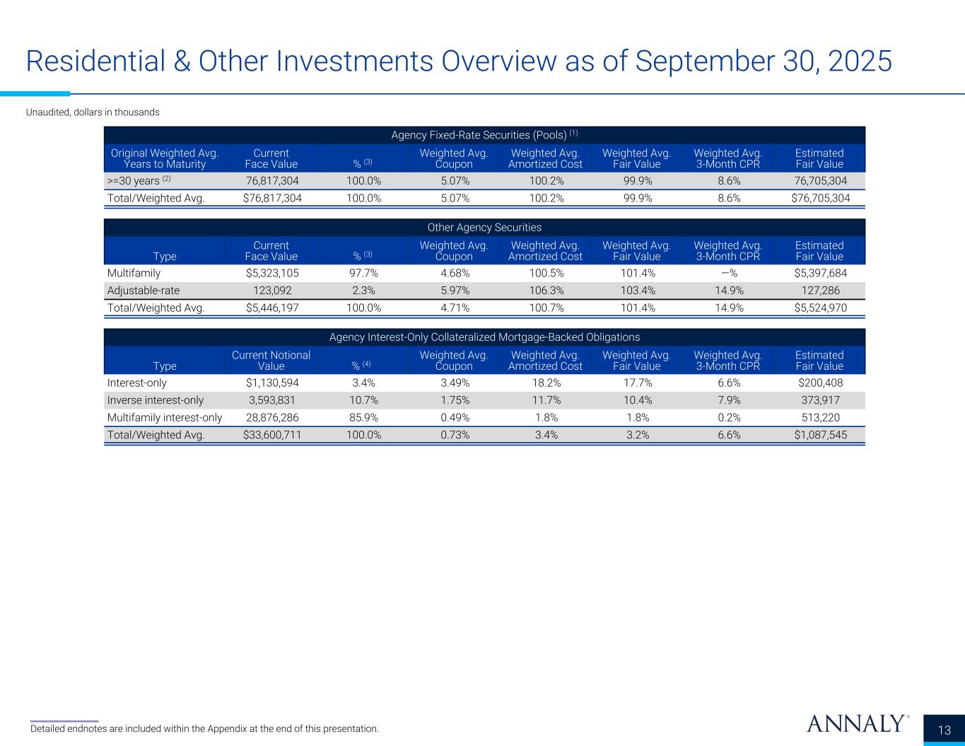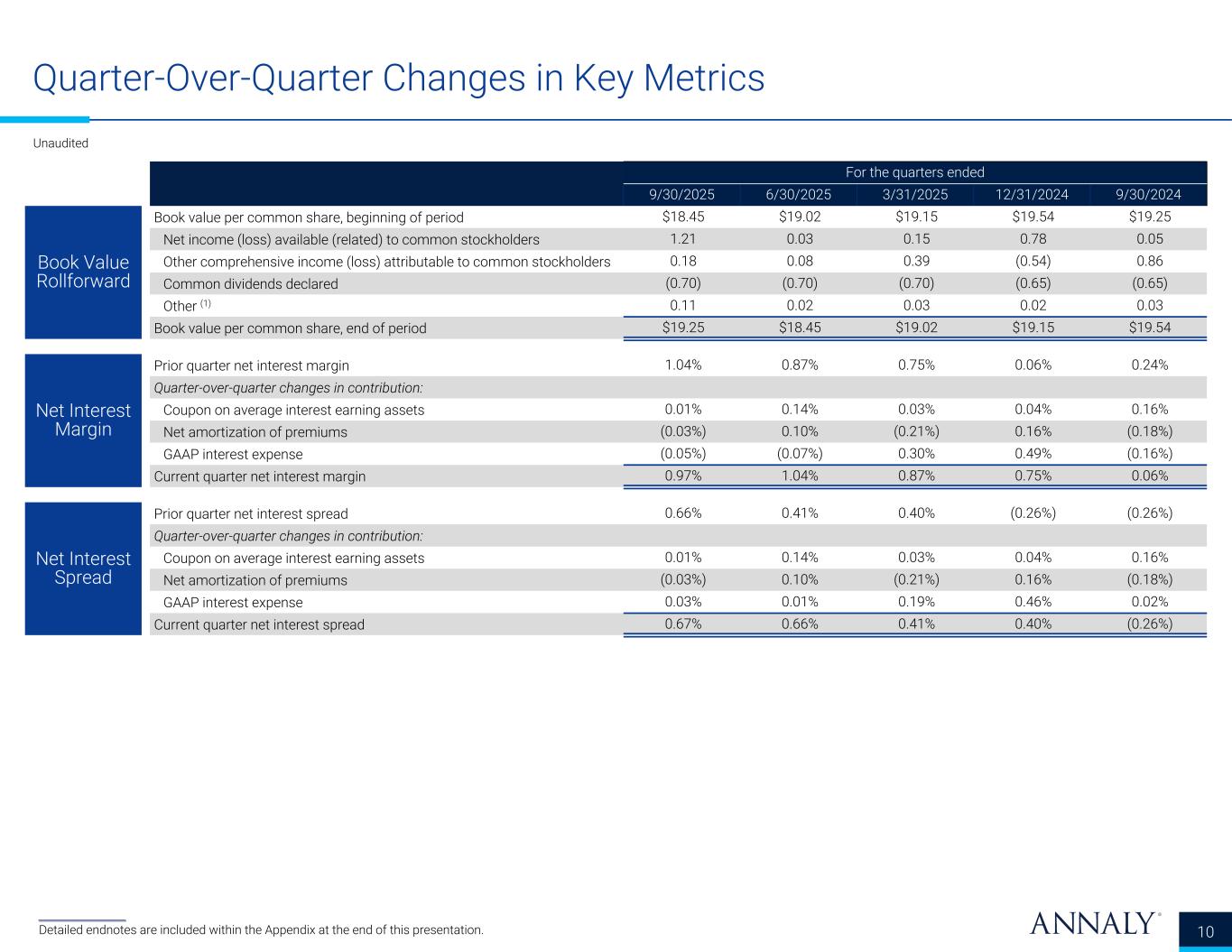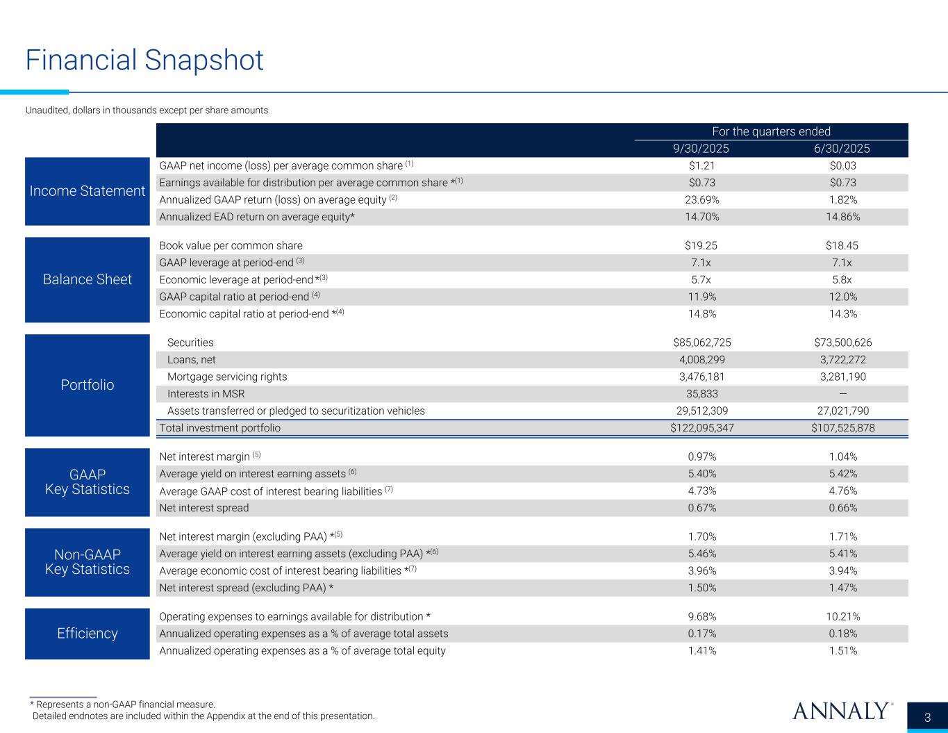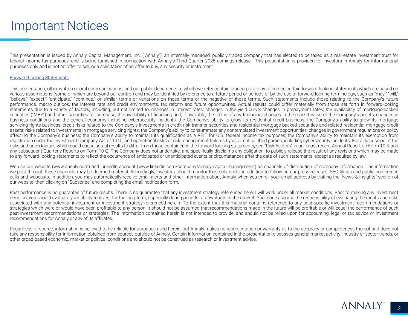 重要提示本演示文稿由Annaly Capital Management, Inc.(“Annaly”)发布,该公司是一家内部管理的上市公司,出于联邦所得税目的,已选择作为房地产投资信托基金征税,并在Annaly发布的2025年第三季度收益报告中提供。本演示文稿仅供Annaly投资者参考,并非出售任何证券或工具的要约或购买要约的招揽。前瞻性陈述本演示文稿、其他书面或口头通讯以及我们提及的公开文件包含或通过引用纳入某些前瞻性陈述,这些陈述基于各种假设(其中一些超出我们的控制范围),可能通过引用未来一个或多个时期或通过使用前瞻性术语来识别,例如“可能”、“将”、“相信”、“预期”、“预期”、“继续”,或类似的术语或这些术语的变体或这些术语的否定。此类声明包括与公司未来业绩、宏观前景、利率和信贷环境、税收改革和未来机会有关的声明。由于多种因素,实际结果可能与前瞻性陈述中所述的结果存在重大差异,包括但不限于利率变化;收益率曲线变化;提前还款率变化;可供购买的抵押贷款支持证券(“MBS”)和其他证券的可用性;融资的可用性,如果有的话,任何融资的条款;公司资产市值的变化;商业条件和包括网络安全事件在内的整体经济的变化;公司发展住宅信贷业务的能力;公司发展抵押贷款服务权业务的能力;与公司投资于信用风险转移证券和住宅抵押贷款支持证券相关的信用风险和相关的住宅抵押贷款信贷资产;与抵押贷款服务权投资相关的风险;公司完成任何预期投资机会的能力;影响公司业务的政府法规或政策的变化;公司维持其作为美国联邦所得税目的的REIT资格的能力;公司维持其根据1940年《投资公司法》免于注册的能力;以及美国或关键第三方的运营风险或风险管理失败,包括网络安全事件。有关可能导致实际结果与前瞻性陈述中包含的结果不同的风险和不确定性的讨论,请参阅我们最近的10-K表格年度报告和随后的10-Q表格季度报告中的“风险因素”。公司不承担并明确表示不承担任何义务,公开发布可能对任何前瞻性陈述进行的任何修订的结果,以反映在此类陈述日期之后发生的预期或意外事件或情况,除非法律要求。我们使用我们的网站(www.annaly.com)和领英账户(www.linkedin.com/company/annaly-capital-management)作为公司信息的分发渠道。我们通过这些渠道发布的信息可能被视为重要信息。因此,除了关注我们的新闻稿、SEC文件以及公开电话会议和网络广播之外,投资者还应该关注这些渠道。此外,当您通过访问我们网站的“新闻与见解”部分注册您的电子邮件地址,然后点击“订阅”并填写电子邮件通知表,您可能会自动收到有关Annaly的电子邮件提醒和其他信息。过去的表现并不能保证未来的结果。无法保证此处引用的任何投资策略在所有市场条件下都能奏效。在做出任何投资决定之前,你应该评估自己的长期投资能力,尤其是在市场低迷时期。您独自承担评估与此处引用的任何潜在投资或投资策略相关的优点和风险的责任。如果本材料包含对过去任何特定投资建议或策略的提及,而这些建议或策略曾经或本将对任何人有利,则不应假定未来提出的建议将有利可图或将与此类过去投资建议或策略的表现相等。此处包含的信息无意提供,也不应被依赖于为Annaly或其任何关联公司提供会计、法律或税务建议或投资建议。无论来源如何,信息被认为对于本文所使用的目的都是可靠的, 但Annaly对其准确性或完整性不作任何陈述或保证,也不对从Annaly以外来源获得的信息承担任何责任。演示文稿中包含的某些信息讨论了一般市场活动、行业或行业趋势,或其他基础广泛的经济、市场或政治条件,不应被解释为研究或投资建议。2