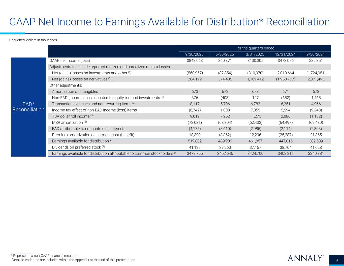 GAAP净收入与可供分配收益之比*和解9__________________*表示非GAAP财务指标。详细尾注包含在本演示文稿末尾的附录中。未经审计,截至9/30/20256/30/20253/31/202512/31/20249/30/2024的季度千美元EAD*调节GAAP净收益(亏损)843,063美元60,371美元130,305美元473,076美元82,351美元不包括报告的已实现和未实现(收益)损失的调整:投资和其他净(收益)损失(1)(560,957)(82,854)(810,970)2,010,664(1,724,051)衍生品净(收益)损失(2)284,199574,4351,169,412(1,958,777)2,071,493其他调整:无形资产摊销673673671673分配给权益法投资的非EAD(收益)损失(3)376(403)147(652)1,465交易费用和非经常性项目(4)8,1175,7066,7826,2514,966非EAD收入(亏损)项目的所得税影响(6,742)1,0037,3555,594(9,248)TBA美元卷收入(5)9,0197,25211,2752,086(1,132)MSR摊销(6)(72,081)(68,804)(62,433)(64,497)(62,480)归属于非控股权益的EAD(4,175)(3,610)(2,985)(2,114)(2,893)溢价摊销调整成本(收益)18,390(3,862)12,296(25,287)21,365可供分配收益*519,882489,906461,857447,015382,509优先股股息(7)41,12737,26037,15738,70441,628归属于普通股股东的可供分配收益*$478,755 $452,646 $424,700 $408,311 $340,881