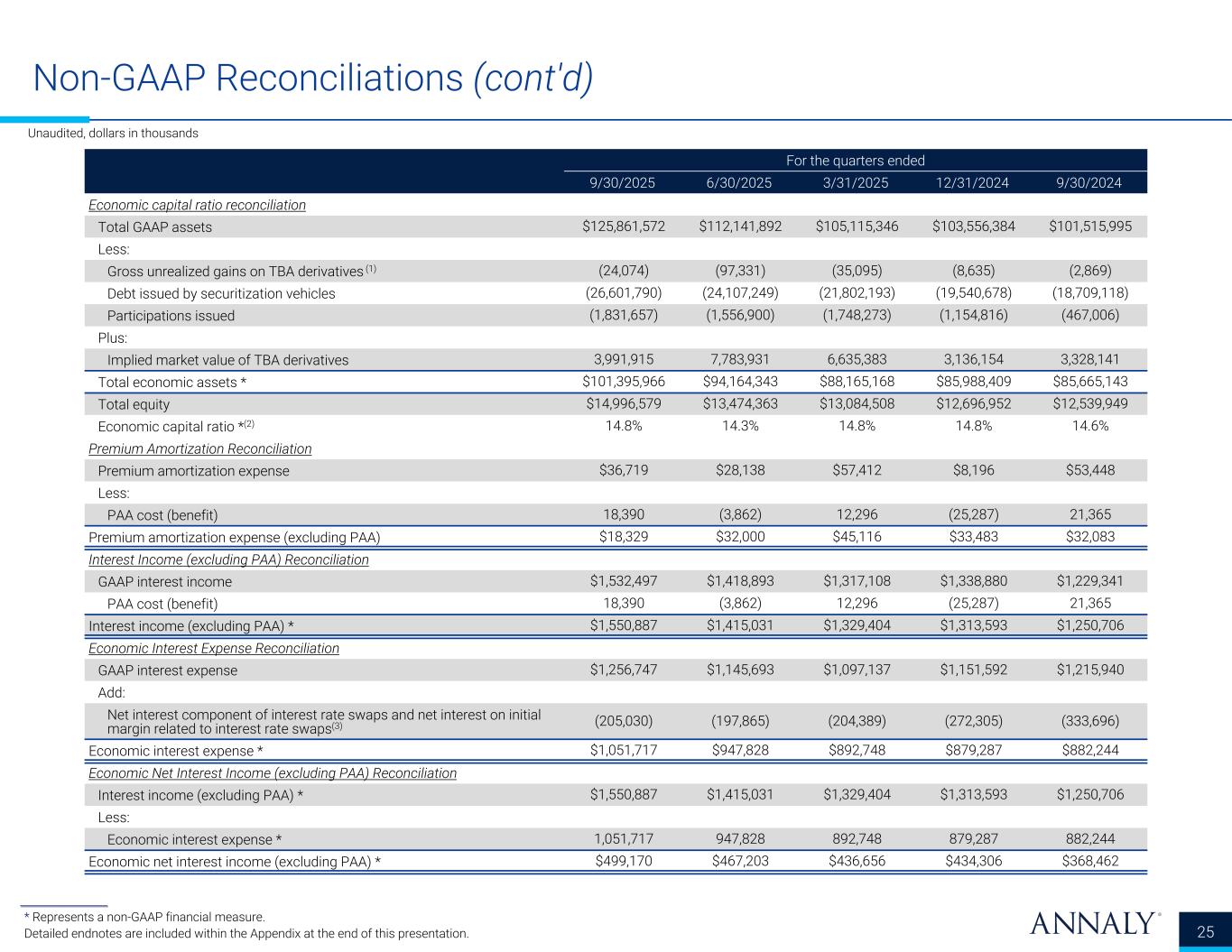 Non-GAAP Reconciliations 22为补充其合并财务报表,该报表是根据GAAP编制和列报的,该公司提供了非GAAP财务指标。这些措施不应被视为替代或优于根据公认会计原则计算的财务措施。虽然旨在更全面地了解公司的业绩和运营情况,但非GAAP财务指标也存在局限性。例如,该公司可能会计算其非GAAP指标,例如可用于分配的收益(“EAD”),或溢价摊销调整(“PAA”),这与同行不同,这使得比较分析变得困难。此外,在不包括PAA的非GAAP措施的情况下,不包括PAA的摊销费用金额不一定代表未来定期摊销的金额,也不表示公司将摊销剩余未摊销溢价的期限。实际和估计预付款的变化将影响溢价摊销的时间和金额,因此也会影响GAAP和非GAAP结果。这些非公认会计准则衡量标准提供了更多细节,以增强投资者对公司同期经营业绩和业务趋势的理解,并用于评估公司与行业同行的业绩。有关这些非公认会计原则财务措施以及与其最直接可比的公认会计原则结果的对账的更多信息将在以下页面提供。本财务补充文件第9页提供了截至2025年9月30日、2025年6月30日、2025年3月31日、2024年12月31日和2024年9月30日止季度的GAAP净收入(亏损)与可供分配的非GAAP收益的对账。可供分配收益、归属于普通股股东的可供分配收益、每平均普通股可供分配收益和年化EAD平均股本回报率公司的主要业务目标是产生可供分配给股东的净收入,并通过审慎选择投资和持续管理其投资组合来保全资本。该公司通过赚取其投资组合的净利差来产生净收入,这是其投资组合的利息收入减去融资、对冲和运营成本的函数。可供分配的收益,其定义为(a)经济净利息收入,(b)TBA美元卷收入,(c)净服务收入减去已实现的MSR摊销,(d)其他收入(亏损)(不包括无形资产摊销、分配给权益法投资的非EAD收入和其他收入(亏损)的其他非EAD部分),(e)一般和管理费用(不包括交易费用和非经常性项目),以及(f)所得税(不包括非EAD收入(亏损)项目的所得税影响),不包括(g)代表对前期累计影响的溢价摊销调整(“PAA”),但不包括当期,与公司的代理抵押贷款支持证券相关的估计长期提前还款速度的环比变化被公司管理层使用,公司认为,分析师和投资者用来衡量其在实现主要业务目标方面的进展。公司寻求通过多种因素实现这一目标,包括投资组合构建、市场风险暴露程度和相关对冲概况、杠杆的使用和形式,所有这些都在公司资本配置政策和风险治理框架的参数范围内运作。公司认为,这些非公认会计原则措施为管理层和投资者提供了有关公司基本经营业绩和投资组合趋势的更多细节,方法是(i)进行调整,以考虑到公允价值变动的不同报告,其中某些工具反映在公认会计原则净收益(亏损)中,而其他工具则反映在其他综合收益(亏损)中,以及(ii)排除公认会计原则净收益(亏损)中的某些未实现、非现金或偶发性部分,以便为公司投资组合的经营业绩提供更多透明度。此外,EAD还可作为投资者评估公司业绩和派息能力的有用指标。年化EAD平均股本回报率是通过将可供分配的收益除以平均股东权益计算得出的,它为投资者提供了有关公司投资的股权资本产生的可供分配收益的更多详细信息。溢价摊销费用按照公认会计原则,公司将溢价或折价摊销或增值为其代理抵押贷款支持证券的利息收入,不包括只付息证券, 多户和反向抵押贷款,在计算有效收益率时考虑到对未来本金提前还款的估计。随着预期预付款和实际预付款之间出现差异,公司会重新计算有效收益率。使用第三方模型和市场信息来预测未来现金流和证券的预期剩余寿命,为每一种证券确定的实际利率被应用,就好像它从证券获得之日起就已经到位一样。证券的摊余成本随后被调整到如果自购买之日起应用新的有效收益率本应存在的金额。摊余成本的调整与利息收入的费用或贷项相抵。利率和其他市场因素的变化将影响预付款速度预测和任何特定时期确认的溢价摊销金额。该公司的GAAP指标包括与该方法相关的摊销和增值的未经调整的影响。该公司的某些非公认会计准则指标不包括PAA的影响,PAA量化了溢价摊销的组成部分,该部分代表估计长期CPR的季度环比变化对前期的累积影响,但不是当期。