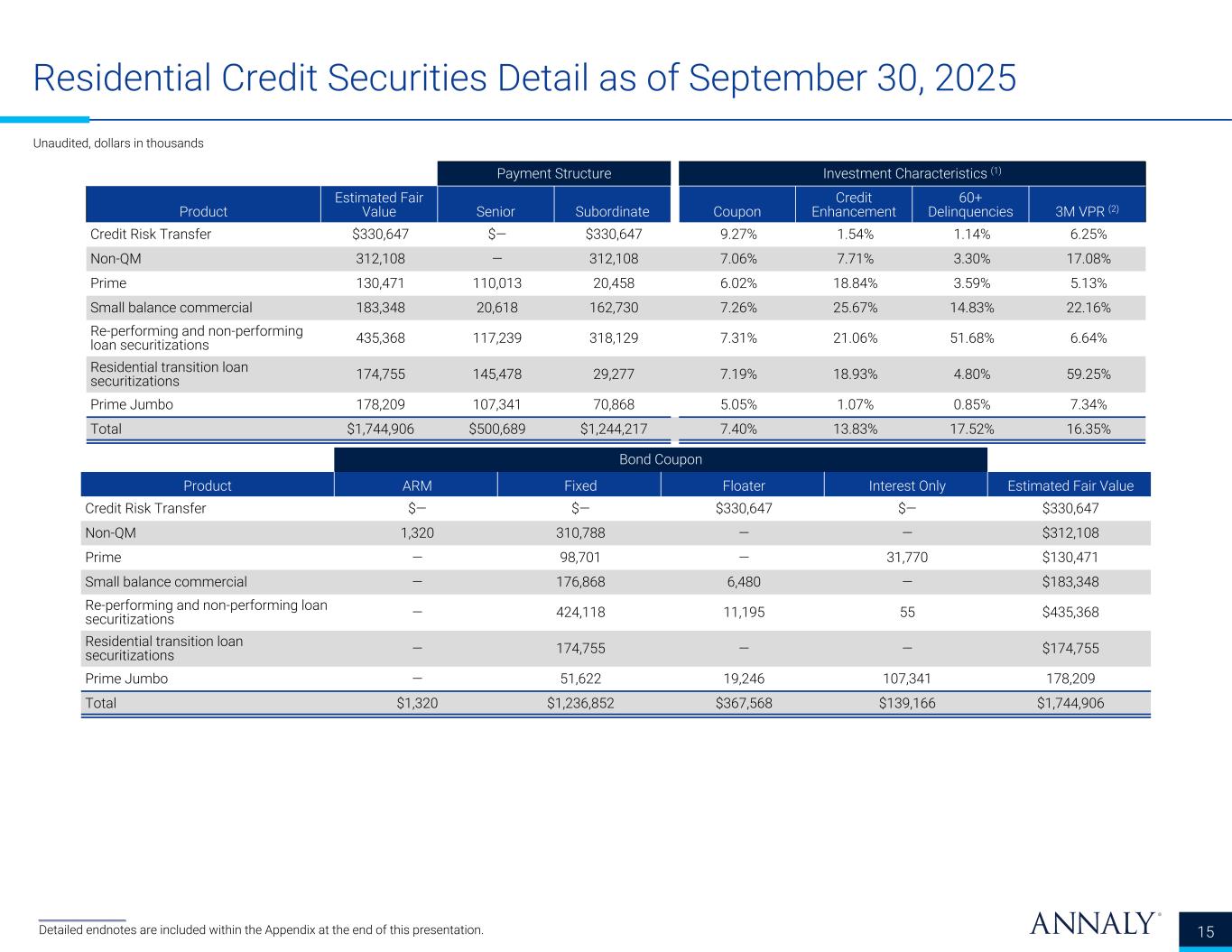 截至2025年9月30日的住宅和其他投资概览(续)14未经审计,单位:千美元__________________详细尾注包含在本演示文稿末尾的附录中。抵押服务权类型未付本金余额服务费(bps)加权平均。票据利率估值(bps)贴现率预计CPR估计公允价值MSR直接持有232,718,660263.3% 149.47.8% 5.8% 3,476,181美元MSR权益1,668,94135,833 MSR有限合伙权益(1)2,174,08329,468合计/加权平均。236,561,684263.3% 148.37.7% 5.7% 3,541,482美元住宅信贷组合部门当前面/名义价值%(2)加权平均息票加权平均。摊余成本加权平均。公允价值估计公允价值住宅信贷风险转移$ 312,9450.9% 9.27% 99.4% 105.7% $ 330,647非QM 319,0480.9% 7.06% 99.3% 97.8% 312,108 Prime 2,324,5930.4% 6.02% 120.3% 122.9% 130,471小额余额商业194,2770.5% 7.26% 94.6% 94.4% 183,348再履约和不良贷款证券化451,6731.2% 7.31% 95.9% 96.4% 435,368住宅过渡贷款证券化174,0970.5% 7.19% 99.7% 100.4% 174,755 Prime JUBO 11,908,492 0.5% 5.05% 175.7% 190.9% 178,209住宅按揭贷款33,602,20795.1% 6.66% 101.1% 99.8% 33,520,608$49,287,332 100.0% 6.69% $35,265,514
