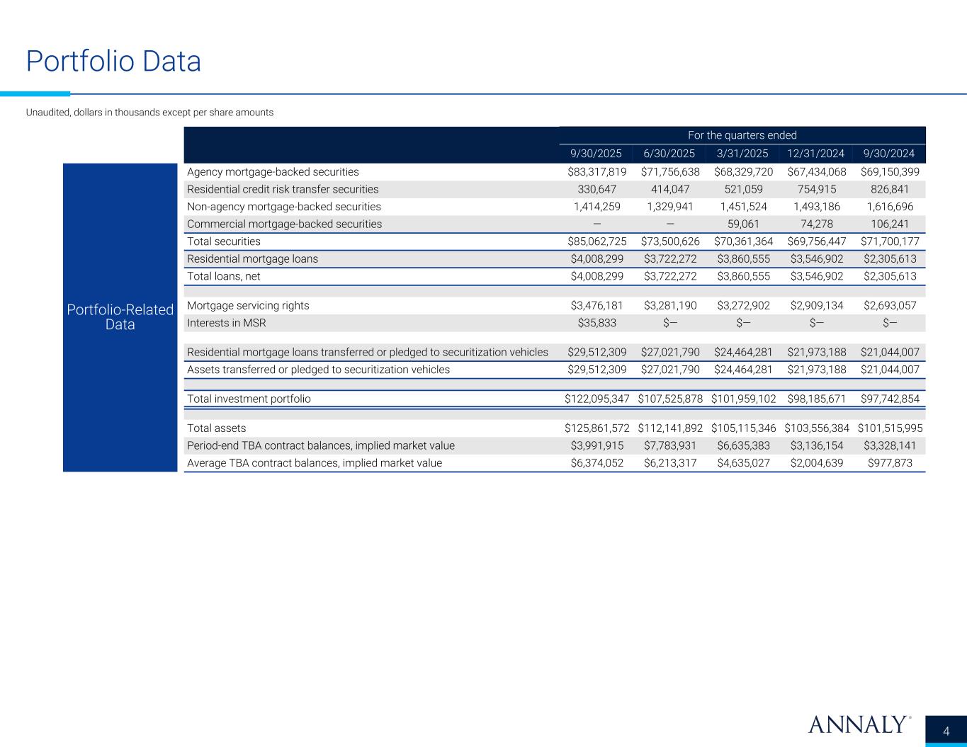 财务快照3未经审计,以千美元计,每股金额除外__________________*表示非GAAP财务指标。详细尾注包含在本演示文稿末尾的附录中。截至2025年9月30日的季度2025年6月30日损益表GAAP每股平均普通股净收入(亏损)(1)1.21美元0.03美元每股平均普通股可分配收益*(1)0.73美元0.73美元年化GAAP平均权益回报率(亏损)(2)23.69% 1.82%年化EAD平均权益回报率*14.70% 14.86%资产负债表每股普通股账面价值19.25美元18.45美元期末GAAP杠杆(3)期末7.1倍7.1倍经济杠杆*(三)期末5.7x 5.8x GAAP资本率(四)11.9% 12.0%期末经济资本率*(4)14.8% 14.3%投资组合证券$ 85,062,725 $ 73,500,626贷款,净额4,008,2993,722,272抵押服务权3,476,1813,281,190 MSR中的权益35,833 —资产转让或质押给证券化工具29,512,30927,021,790总投资组合$ 122,095,347 $ 107,525,878 GAAP关键统计数据净息差(5)0.97% 1.04%生息资产平均收益率(6)5.40% 5.42% GAAP计息负债平均成本(7)4.73% 4.76%净利差0.67% 0.66% Non-GAAP关键统计数据净息差(不含PAA)*(五)1.70% 1.71%生息资产平均收益率(不含PAA)*(六)5.46% 5.41%有息负债平均经济成本*(七)3.96% 3.94%净利差(不含PAA)*1.50% 1.47%效率运营费用与可得收益之比用于分配*9.68% 10.21%年化营业费用占平均总资产的百分比0.17% 0.18%年化营业费用占平均总股本的百分比1.41% 1.51%