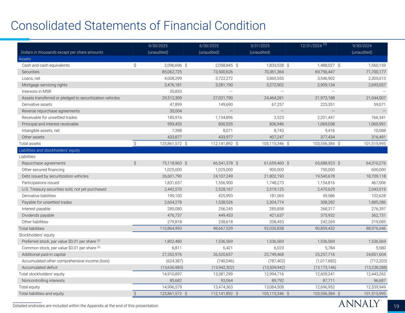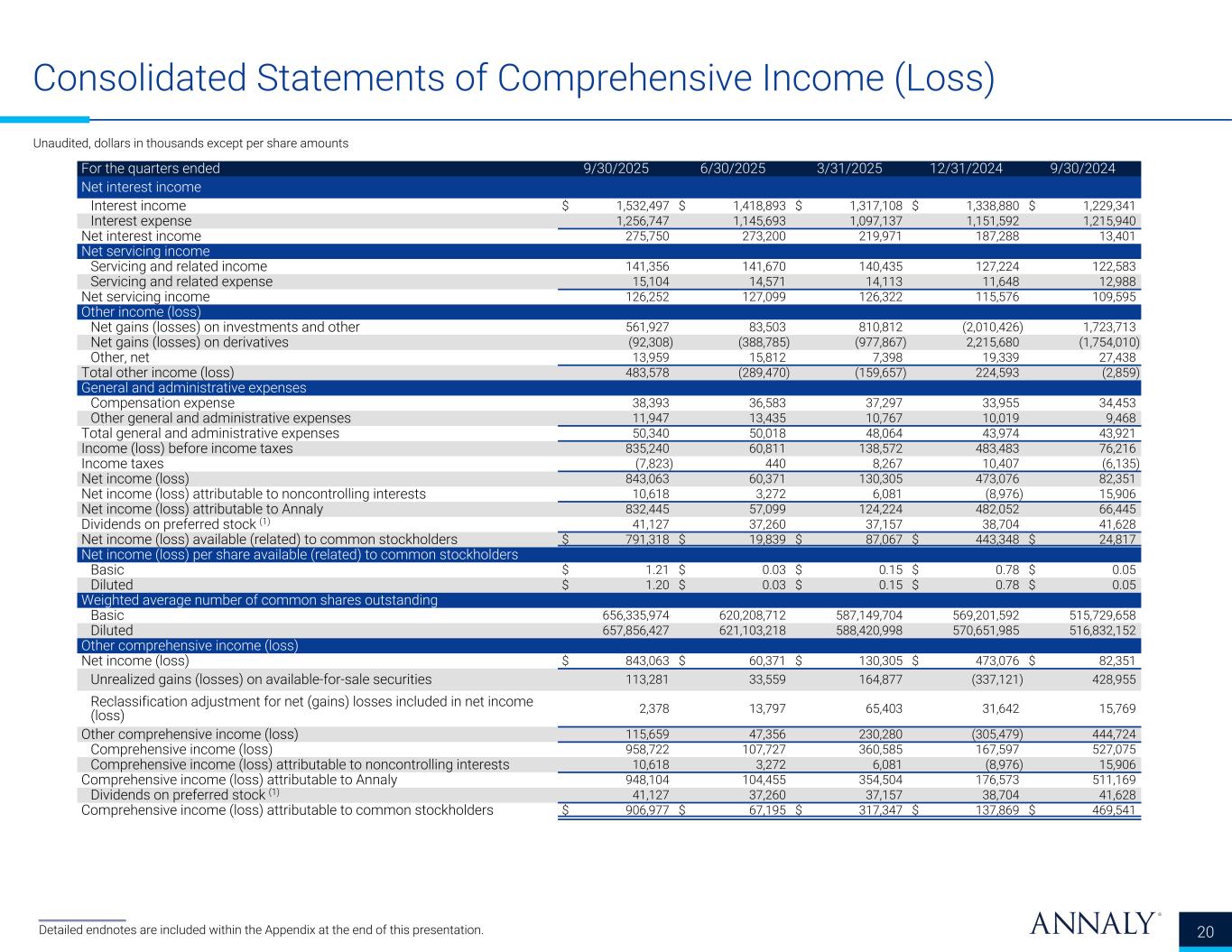 财务状况综合报表19__________________详细的尾注包含在本演示文稿末尾的附录中。9/30/20256/30/20253/31/202512/31/20249/30/2024千美元,每股金额除外(未经审计)(未经审计)(未经审计)(未经审计)资产现金和现金等价物$ 2,096,696 $ 2,058,845 $ 1,833,528 $ 1,488,027 $ 1,560,159证券85,062,72573,500,62670,361,36469,756,44771,700,177贷款,净额4,008,2993,722,2723,860,5553,546,9022,305,613抵押服务权3,476,1813,281,1903,272,9022,909,1342,693,057 MSR权益35,833 ————资产转让或质押给证券化工具29,512,30927,021,79024,464,28121,973,18821,044,007衍生资产47,899149,69067,257225,35159,071逆回购协议35,004 ————应收未结算贸易款185,9161,134,8962,5232,201,447766,341应收本息959,435830,535836,9461,069,0381净额7,3988,0718,7439,41610,088其他资产433,877433,977407,247377,434316,491总资产125,861,572美元112,141,892美元105,115,346美元103,556,384美元101,515,995美元负债和股东权益负债回购协议75,118,963美元66,541,378美元61,659,460美元65,688,923美元64,310,276其他担保融资1,025,0001,025,000900,00075,000600,000证券化工具发行的债务26,601,79024,107,24921,802,19319,540,67818,709,118参与发行1,831,657尚未购买2,442,5702,528,1672,519,1252,470,6292,043,519衍生负债199,100425,993181,06559,586102,628应付未结算交易2,604,2781,538,5262,304,774308,2821,885,286应付利息285,080256,245285,858268,317276,397应付股利476,737449,453421,6375,932362,731其他负债279,818238,618208,453242,269219,085负债总额110,864,99398,667,52992,030,83890,859,43288,976,046股东权益每股面值0.01美元(3)6,8116,4216,0235,7845,580 额外实收资本 27,352,97626,520,65725,749,46825,257,71624,851,604累计其他综合收益(亏损)(624,387)(740,046)(787,402)(1,017,682)(712,203)累计亏损(13,626,983)(13,942,302)(13,509,942)(13,173,146)(13,238,288)股东权益合计14,910,89713,381,29912,994,71612,609,24112,443,262非控股权益85,68293,06489,79287,71196