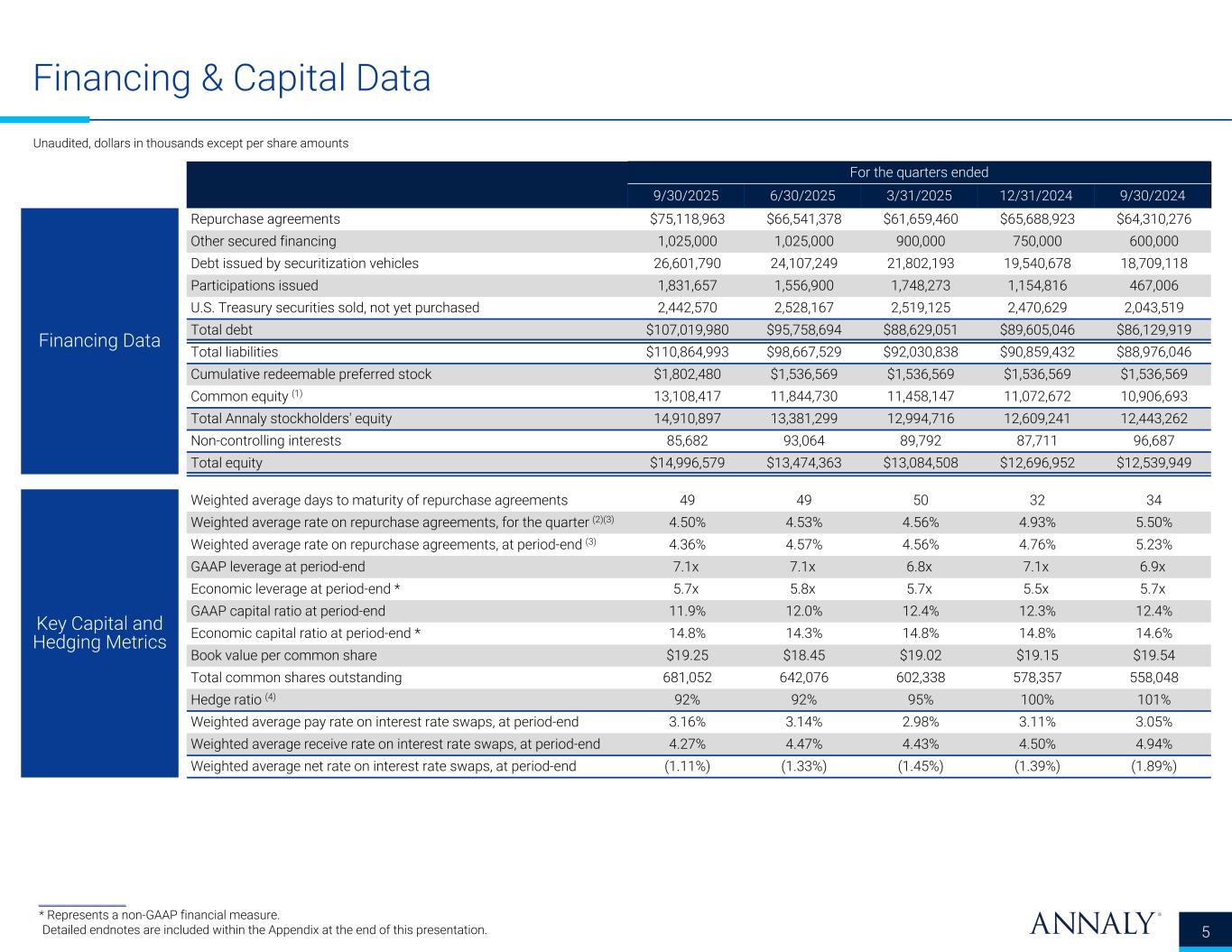 融资和资本数据5截至9/30/20256/30/20253/31/202512/31/20249/30/2024融资数据回购协议$ 75,118,963 $ 66,541,378 $ 61,659,460 $ 65,688,923 $ 64,310,276其他担保融资1,025,0001,025,000900,00075,000600,000由证券化工具发行的债务26,601,79024,107,24921,802,19319,540,67818,709,118参与发行1,831,6571,556,9001,748,2731,154,816467,006已售美国国债,尚未购买2,442,5702,528,1672,519,1252,470,6292,043,519总债务$ 107,019,980 $ 95,758,694 $ 88,629,051 $ 89,605,046 $ 86,129,919总负债$ 110,864,993 $ 98,667,529 $ 92,030,838 $ 90,859,432 $ 88,976,046累计可赎回优先股$ 1,802,480 $ 1,536,569 $ 1,536,569 $ 1,536,569 $ 1,536,569共同权益(1)13,108,41711,844,73011,458,14711,072,67210,906,69本季度(2)(3)4.50% 4.53% 4.56% 4.93% 5.50%回购协议加权平均利率,期末(3)4.36% 4.57% 4.56% 4.76% 5.23% GAAP期末杠杆率7.1x 7.1x 6.8x 7.1x 6.9x期末经济杠杆率*5.7x 5.8x 5.7x 5.5x 5.7x期末GAAP资本率11.9% 12.0% 12.4% 12.3% 12.4%期末经济资本率*14.8% 14.3% 14.8% 14.8% 14.6%每股普通股账面价值$ 19.25 $ 18.45 $ 19.02 $ 19.15 $ 19.54已发行普通股总数681,052642,076602,338578,357558,048对冲比率(4)92% 92% 95% 100% 101%利率掉期加权平均支付率,期末3.16% 3.14% 2.98% 3.11% 3.05%利率互换加权平均收款利率期末4.27% 4.47% 4.43% 4.50% 4.94%利率互换加权平均净利率期末(1.11%)(1.33%)(1.45%)(1.39%)(1.89%)未经审计,除每股金额外单位千美元__________________*表示非GAAP财务指标。详细尾注包含在本演示文稿末尾的附录中。