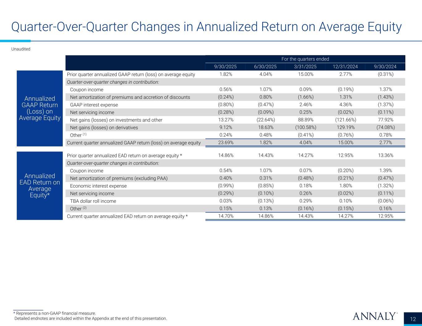 关键指标的季度环比变化(续)11未经审计的__________________*表示非GAAP财务指标。详细尾注包含在本演示文稿末尾的附录中。截至9/30/20256/30/20253/31/202512/31/20249/30/2024止季度净息差(不含PAA)*上季度净息差(不含PAA)*1.71% 1.69% 1.71% 1.52% 1.58%环比变化贡献:平均生息资产票息(含平均TBA美元滚存余额)0.02% 0.06%(0.09%)(0.01%)0.16%保费净摊销(不含PAA)0.05% 0.04%(0.05%)(0.03%)(0.06%)TBA美元滚存收入0.01%(0.02%)0.03% 0.02%(0.01%)经济利息支出(0.09%)(0.06%)0.09% 0.21%(0.15%)当季净息差(不含PAA)*1.70% 1.71% 1.69% 1.71% 1.52%净利差(不含PAA)*上季度净利差(不含PAA)*1.47% 1.35% 1.47% 1.32% 1.24%贡献环比变化:平均生息资产息票0.01% 0.14% 0.04% 0.16%保费净摊销(不含PAA)0.04%(0.06%)(0.05%)经济利息支出(0.02%)(0.06%)(0.14%)当季净息差(不含PAA)*1.50% 1.47% 1.35% 1.47% 1.32%