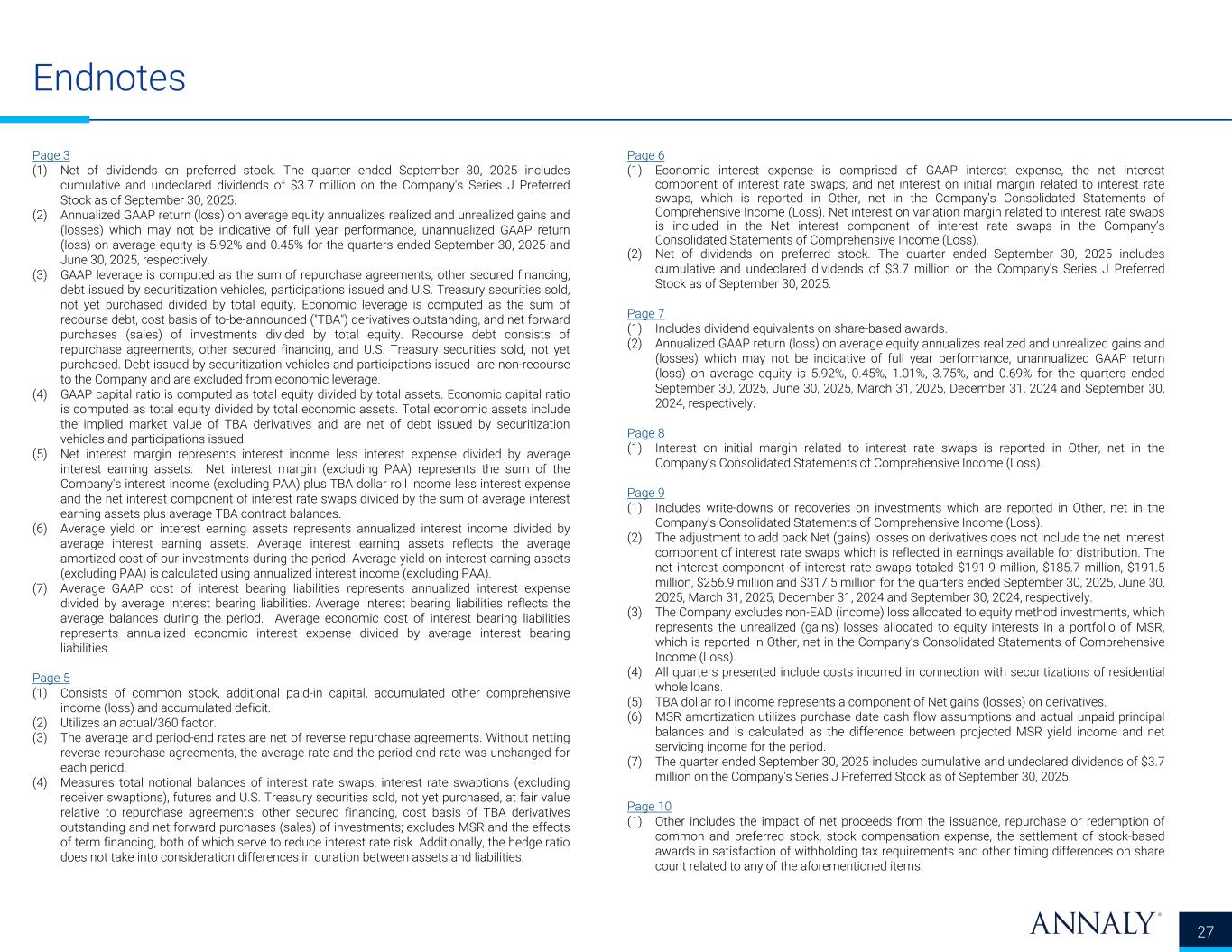 第6页(1)经济利息费用由GAAP利息费用、利率掉期的净利息部分以及与利率掉期相关的初始保证金的净利息组成,在公司综合综合收益(亏损)报表的其他净额中列报。与利率掉期相关的变动保证金净利息计入公司综合综合收益(亏损)表中的利率掉期净利息部分。(2)优先股股息净额。截至2025年9月30日的季度包括截至2025年9月30日公司J系列优先股的累计未宣布股息370万美元。第7(1)页包括以股份为基础的奖励的股息等价物。(2)年化GAAP平均权益回报率(亏损)年化已实现和未实现的收益和(亏损)可能不代表全年业绩,截至2025年9月30日、2025年6月30日、2025年3月31日、2024年12月31日和2024年9月30日的季度,未年化GAAP平均权益回报率(亏损)分别为5.92%、0.45%、1.01%、3.75%和0.69%。第8页(1)与利率掉期相关的初始保证金利息在公司综合综合收益(亏损)表的其他净额中列报。第9(1)页包括在公司综合综合收益(亏损)表其他净额中列报的投资减记或回收。(2)加回衍生工具净(收益)损失的调整不包括反映在可供分配收益中的利率掉期净利息部分。截至2025年9月30日、2025年6月30日、2025年3月31日、2024年12月31日和2024年9月30日的季度,利率掉期的净利息部分分别为1.919亿美元、1.857亿美元、1.915亿美元、2.569亿美元和3.175亿美元。(3)公司不包括分配给权益法投资的非EAD(收益)损失,后者表示分配给MSR投资组合的股权的未实现(收益)损失,该损失在公司综合综合收益(损失)报表的其他净额中报告。(4)列报的所有季度均包含与住宅整体贷款证券化相关的成本。(5)TBA美元展期收入是衍生工具净收益(亏损)的一部分。(6)MSR摊销采用购买日期现金流假设和实际未付本金余额,计算为该期间预计MSR收益率收入和净服务收入之间的差额。(7)截至2025年9月30日的季度包括截至2025年9月30日公司J系列优先股的累计未宣布股息370万美元。第10页(1)其他包括发行、回购或赎回普通股和优先股的净收益、股票补偿费用、为满足预扣税要求而结算基于股票的奖励以及与上述任何项目相关的其他时间差异对股票计数的影响。尾注第3(1)页优先股股息净额。截至2025年9月30日的季度包括截至2025年9月30日公司J系列优先股的累计未宣布股息370万美元。(2)年化GAAP平均权益回报率(亏损)年化已实现和未实现的收益和(亏损)可能不代表全年业绩,截至2025年9月30日和2025年6月30日的季度,未年化GAAP平均权益回报率(亏损)分别为5.92%和0.45%。(3)GAAP杠杆计算为回购协议、其他担保融资、证券化工具发行的债务、已发行的参与和已出售、尚未购买的美国国债的总和除以总股本。经济杠杆计算为有追索权债务、待公布(“TBA”)衍生工具的成本基础、投资的远期净买入(卖出)除以总权益之和。追索权债务由回购协议、其他担保融资、出售的美国国债、 尚未购买。证券化工具发行的债务和发行的参股对公司无追索权,不计入经济杠杆。(4)GAAP资本比率计算为总股本除以总资产。经济资本比率的计算方法是总股本除以总经济资产。总经济资产包括TBA衍生品的隐含市值,并扣除证券化工具发行的债务和发行的参与。(5)净息差是指利息收入减去利息支出除以平均生息资产。净息差(不含PAA)是指公司利息收入(不含PAA)加上TBA美元滚动收入减去利息支出和利率掉期的净利息部分之和除以平均生息资产加上平均TBA合同余额之和。(6)生息资产平均收益率表示年化利息收入除以平均生息资产。平均生息资产反映了我们在该期间投资的平均摊销成本。生息资产(不含PAA)平均收益率采用年化利息收入(不含PAA)计算。(7)平均GAAP计息负债成本表示年化利息支出除以平均计息负债。平均计息负债反映期间的平均余额。计息负债的平均经济成本表示年化经济利息支出除以平均计息负债。第5(1)页由普通股、追加实收资本、累计其他综合收益(亏损)和累计亏损构成。(2)利用实际/360因数。(3)平均和期末利率为净逆回购协议。未净额逆回购协议,各期平均利率和期末利率均不变。(4)衡量利率掉期、利率掉期期权(不包括接收方掉期期权)、以相对于回购协议的公允价值出售但尚未购买的期货和美国国债的总名义余额、其他担保融资、未偿还TBA衍生品的成本基础和投资的远期净买入(卖出);不包括MSR和定期融资的影响,这两者都有助于降低利率风险。此外,套期保值比率没有考虑资产和负债之间的久期差异。27