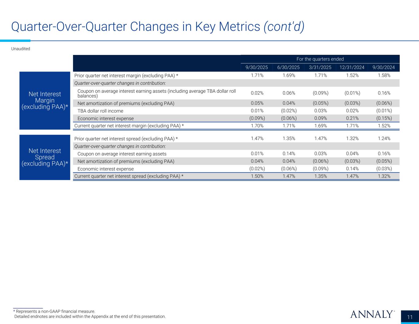 关键指标10的季度环比变化未经审计的__________________详细尾注包含在本演示文稿末尾的附录中。截至9/30/20256/30/20253/31/202512/31/20249/30/2024止季度每股普通股账面价值期初账面价值$ 18.45 $ 19.02 $ 19.15 $ 19.54 $ 19.25普通股股东可得净收益(亏损)(相关)1.2 10.03 0.15 0.78 0.05归属于普通股股东的其他综合收益(亏损)0.18 0.08 0.39(0.54)0.86宣派的普通股股息(0.70)(0.70)(0.70)(0.65)(0.65)其他(1)0.11 0.02 0.03 0.02 0.03每股普通股账面价值,期末19.25美元18.45美元19.02美元19.15美元19.54美元净息差上季度净息差1.04% 0.87% 0.75% 0.06% 0.24%贡献环比变化:平均生息资产票息0.01% 0.14% 0.03% 0.04% 0.16%保费净摊销(0.03%)0.10%(0.21%)0.16%(0.18%)GAAP利息支出(0.05%)(0.07%)0.30% 0.49%(0.16%)当季净息差0.97% 1.04% 0.87% 0.75% 0.06%净息差上季度净息差0.66% 0.41% 0.40%(0.26%)(0.26%)贡献环比变化:平均生息资产票息0.01% 0.14% 0.03% 0.04% 0.16%保费净摊销(0.03%)0.10%(0.21%)0.16%(0.18%)GAAP利息支出0.03% 0.01% 0.19% 0.46% 0.02%当季净利差0.67% 0.66% 0.41% 0.40%(0.26%)
