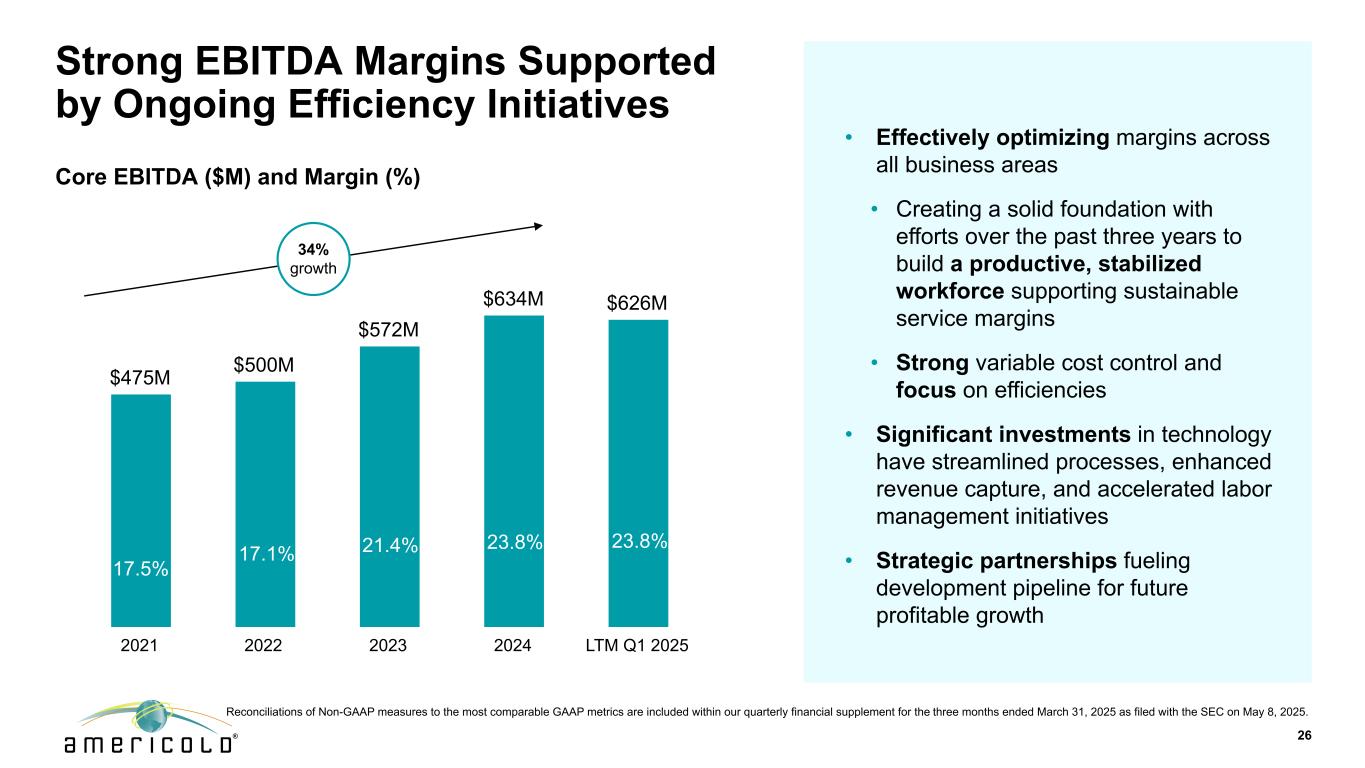 强劲的同店仓库收入和NOI增长25注:收入代表LTM数字。百万美元1)基于截至2025年3月31日固定仓储承诺合同和租赁的年度承诺租金和仓储收入2)表示截至3月31日具有固定仓储承诺和租赁的合同的加权平均期限,2025年•从按需合同向固定存储承诺合同和租赁过渡的情况显着改善•自2021年以来,整个仓库部分的固定存储合同增加了128%,现在占:• 60%的仓库租金和存储总收入(2021年为39%)(1)•8年加权平均规定期限(2)•我们网络的范围和广度使我们能够达成固定存储承诺•随着我们将最近的收购整合到Americold的标准中,有机会进一步提高业绩•仓库NOI从租金和存储两方面的增长和仓库服务同店仓库收入同店仓库NOI贡献(NOI)利润率:34.4%同店仓库服务同店租金和存储14.64亿美元20.14亿美元22.58亿美元23.42亿美元6.15亿美元8.62亿美元10.25亿美元10.19亿美元10.25亿美元8.49亿美元11.52亿美元12.33亿美元13.23亿美元13.31亿美元2021202220232024 LTM Q1 2025 + 60%增长4.78亿美元6亿美元7.09亿美元8.07亿美元8.10亿美元4.04亿美元5.40亿美元6.65亿美元6.35亿美元6.36亿美元6.36亿美元7.43亿美元6.40亿美元1.72亿美元2021202220232024 LTM Q1 2025 31.4% 29.8% 32.8