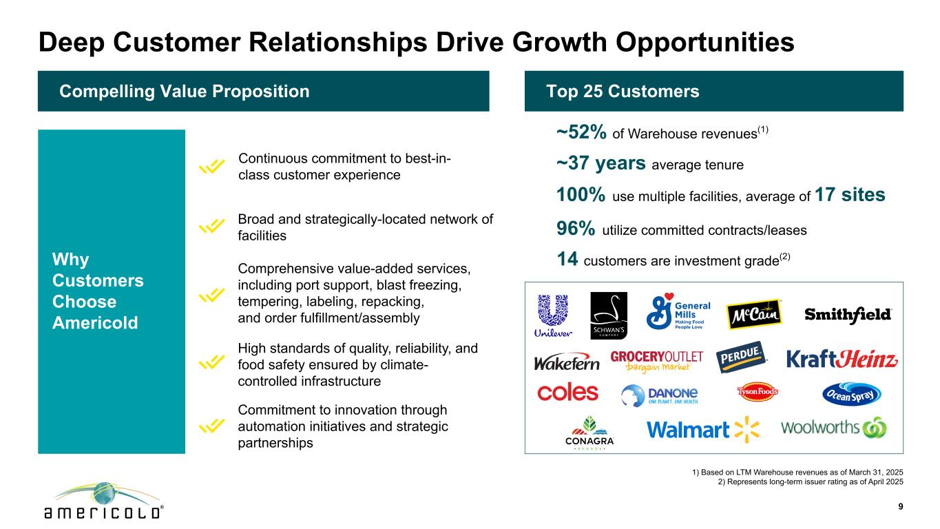客户为何选择Americold深厚的客户关系推动增长机会广阔且位于战略位置的设施网络综合增值服务,包括端口支持、爆破冷冻、钢化、贴标、重新包装以及订单履行/组装前25名客户持续致力于一流的客户体验高标准的质量、可靠性和食品安全,由气候控制的基础设施确保承诺通过自动化举措和战略合作伙伴关系进行创新9~37年平均任期14名客户为投资级(2)96%使用承诺合同/租赁~仓库收入的52%(1)1)基于截至3月31日的LTM仓库收入,2025年2)代表长期发行人评级截至2025年4月令人信服的价值主张100%使用多种设施,平均17个站点