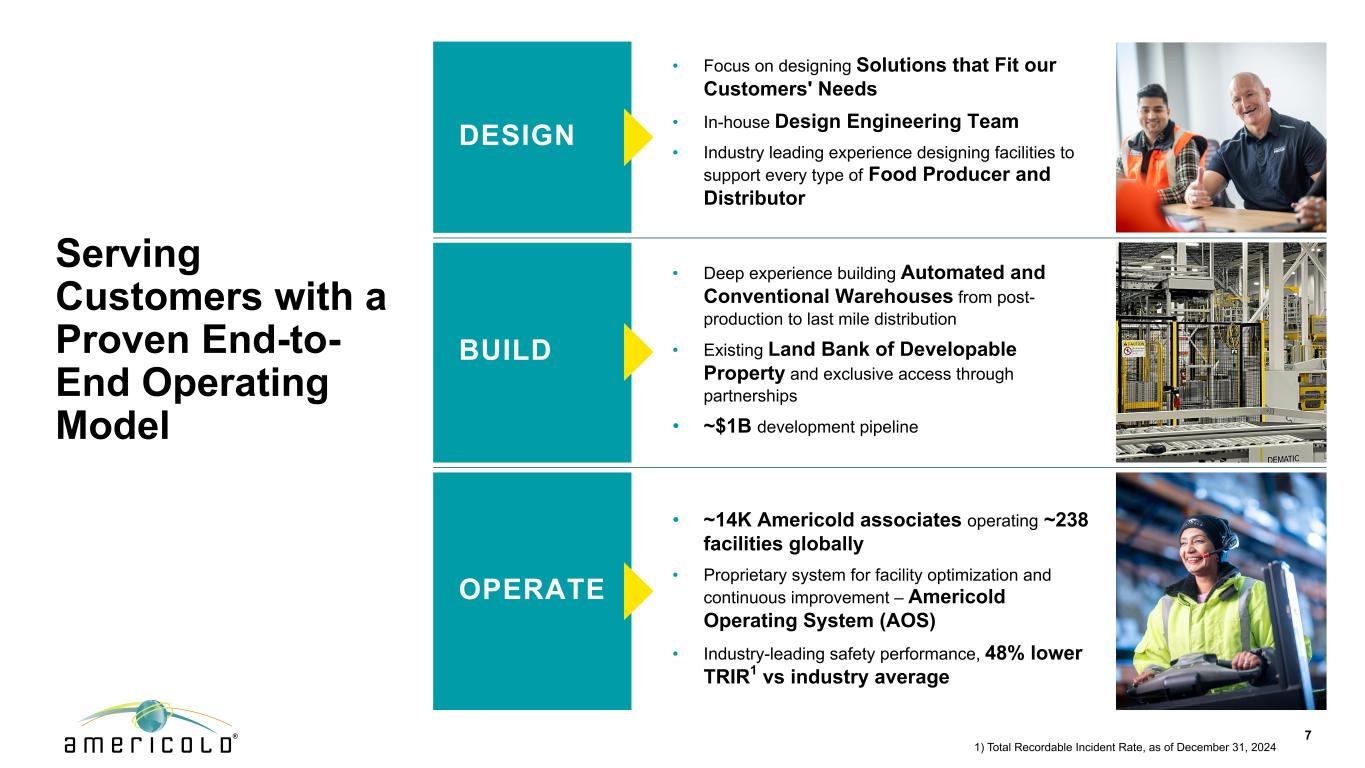 7以经过验证的端到端运营模式为客户服务•专注于设计适合客户需求的解决方案•内部设计工程团队•业界领先的设施设计经验,以支持每一种类型的食品生产商和分销商•~14K Americold员工在全球运营~238个设施•用于设施优化和持续改进的专有系统– Americold操作系统(AOS)•行业领先的安全性能,TRIR1较行业平均水平低48% •从后期生产到最后一公里配送的自动化和常规仓库建设经验丰富•可开发物业的现有土地银行和通过合作伙伴关系的独家访问权•~$ 1B开发管道设计运营Build1)截至2024年12月31日的总可记录事故率