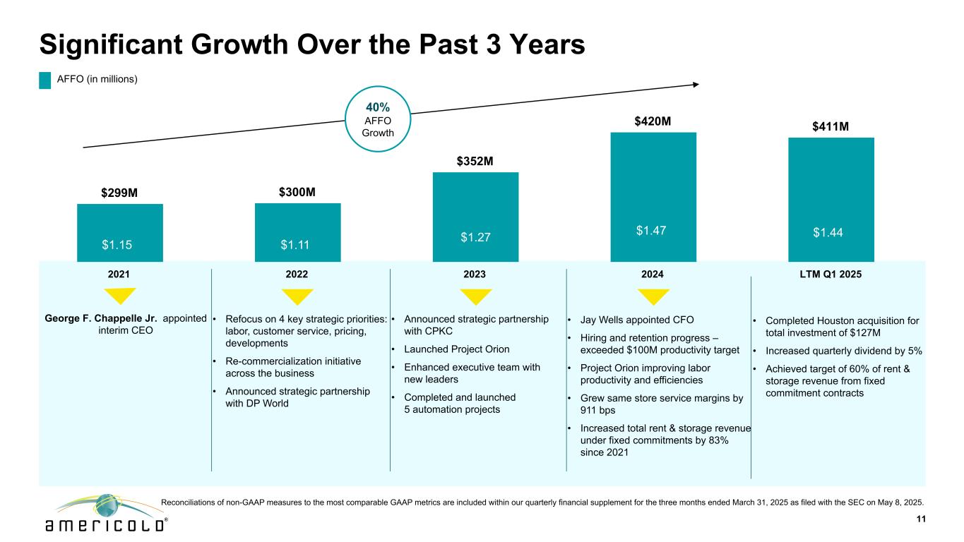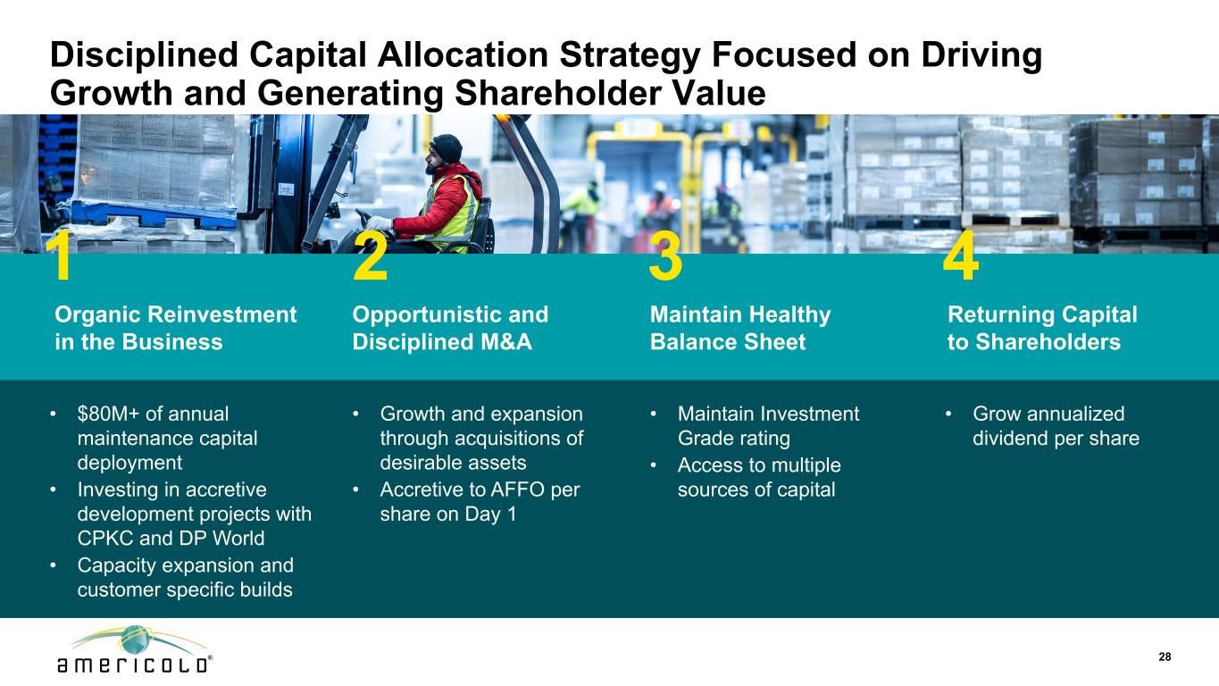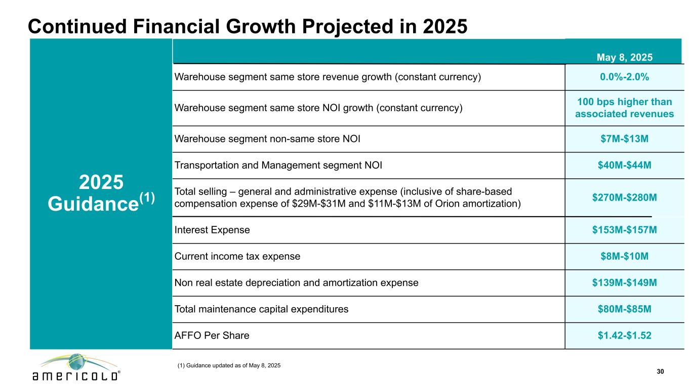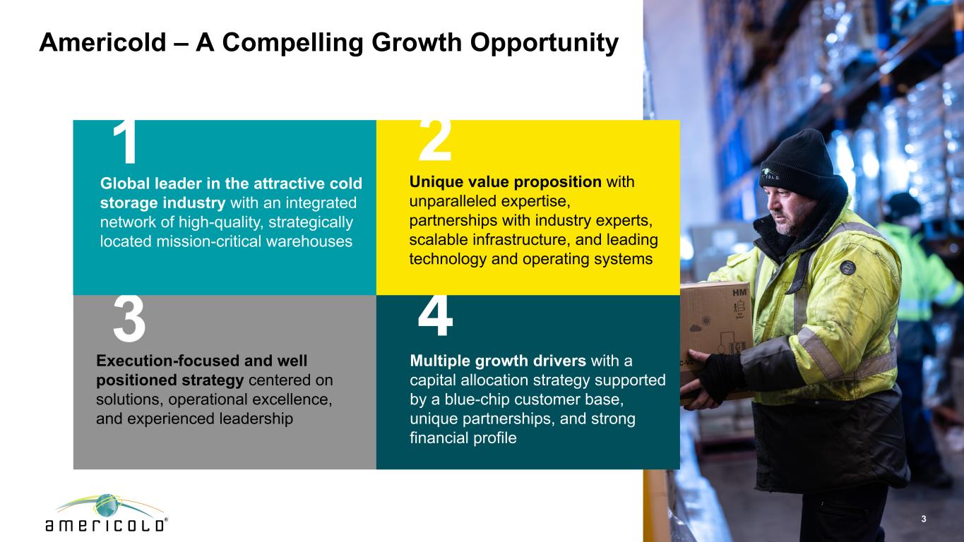 免责声明本演示文稿包含有关未来事件和预期的陈述,这些陈述构成前瞻性陈述。前瞻性陈述基于我们对未来财务和经营业绩及增长计划的信念、假设和预期,并考虑到我们目前可获得的信息。这些陈述不是历史事实的陈述。前瞻性陈述涉及风险和不确定性,可能导致我们的实际结果与我们在任何前瞻性陈述中表达或暗示的对未来结果的预期存在重大差异,您不应过分依赖此类陈述。可能导致这些差异的因素包括:国家、国际、区域和地方经济状况,包括贸易争端和对进口到美国的商品和出口到其他国家的商品征收关税的影响和不确定性;经济放缓或衰退时期;供应链中断的影响,其中包括劳动力供应、原材料供应、制造以及食品生产和运输的影响,以及;与公共卫生危机、我们的地理市场或温控仓库行业的不利经济或房地产发展相关的不确定性和风险;一般经济状况;收购风险,包括未能识别或完成有吸引力的收购,或收购未能按照预测履约,或我们未能从我们的收购中实现预期收益,包括协同效应,或我们的计划和运营中断,或与我们的收购相关的未知或或有负债;与现有物业的扩张和新物业的开发相关的风险,包括未能在预期时间范围内或根本无法达到预算或稳定的回报;我们的信息技术系统出现故障、系统转换和集成、网络安全攻击或我们的信息安全系统遭到破坏,网络或流程可能导致业务中断或机密信息丢失;与隐私和数据安全问题相关的风险,以及数据收集和传输限制和相关外国法规;重大客户合同违约或不续签;鉴于我们客户合同的性质,收入的不确定性;利率和运营成本增加;我们未能以有吸引力的条款或根本无法获得必要的外部融资;与以下相关的风险或包含的限制,我们的债务融资;储存率下降或空置率增加;与当前和潜在的国际业务和物业相关的风险;难以将我们的业务扩展到新市场,包括国际市场;与物业的部分所有权相关的风险,包括由于我们对此类投资缺乏控制以及此类实体未能按照预测履行职责;我们未能保持我们作为房地产投资信托基金(“REIT”)的地位;可能的环境负债,包括成本,因对我们目前或以前拥有的财产的污染进行必要的补救而可能产生的罚款或处罚;金融市场波动;我们的竞争对手的行为及其与我们竞争的能力不断增强;地缘政治冲突,例如俄罗斯和乌克兰之间的持续冲突或中东冲突死灰复燃;通货膨胀和利率上升;劳动力和电力成本;劳动力短缺;适用的政府法规和税收立法的变化,包括在国际市场;与增加欧洲业务和物业有关的额外风险;房地产和分区法律的变化以及房地产税率的提高;我们与我们的员工的关系;根据我们的集体谈判协议和与雇佣相关的诉讼发生任何停工或任何纠纷;由于我们参与多雇主养老金计划而产生的责任;未投保的损失或超出我们保险范围的损失;潜在的责任,与我们的内部卡车运输服务相关的成本和监管影响,以及与使用第三方卡车运输服务提供商向我们的客户提供运输服务相关的潜在中断;由于我们作为公开交易的房地产投资信托基金的运营而产生的成本和时间要求;外币汇率的变化;我们的组成文件和马里兰州法律中的反收购条款的影响,这可能会使收购我们变得更加困难,限制我们的股东试图更换我们的董事并影响我们的实益权益普通股的价格, 每股面值0.01美元;或我们的普通股发行的潜在稀释效应,包括我们正在进行的上市计划。“预期”、“相信”、“继续”、“估计”、“预期”、“目标”、“目标”、“打算”、“可能”、“机会”、“计划”、“潜力”、“近期”、“长期”、“预测”、“假设”、“项目”、“指导”、“预测”、“展望”、“目标”、“趋势”、“应该”、“可能”、“将”等词语和类似表述旨在识别此类前瞻性陈述,尽管并非所有前瞻性陈述都可能包含此类词语。本演示文稿中包含的前瞻性陈述示例包括,除其他外,关于我们预期的扩张和发展管道以及我们在扩张和发展机会方面的目标投资资本回报率的陈述。我们完全根据这些警示因素来限定任何前瞻性陈述。其他风险、不确定性和因素,包括我们截至2024年12月31日止年度的10-K表格年度报告中“风险因素”下讨论的风险、不确定性和因素,以及我们向美国证券交易委员会提交的其他报告,可能导致我们的实际结果与我们所做的任何前瞻性陈述中预测的结果存在重大差异。我们不承担以任何理由更新或修改这些前瞻性陈述的义务,或更新实际结果可能与这些前瞻性陈述中的预期存在重大差异的原因,即使未来有新信息可用,但法律要求的范围除外。非GAAP指标本演示文稿包含非GAAP财务指标,包括AFFO、核心EBITDA、核心EBITDA利润率、备考(“PF”)核心EBITDA、净债务与备考核心EBITDA、NOI和利润率、固定货币基础和维持资本支出。这些非GAAP指标的定义和与其最具可比性的GAAP指标的对账包含在我们于2025年5月8日向SEC提交的截至2025年3月31日止三个月的季度财务补充文件中。本演示文稿中包含的这些非公认会计原则措施中的每一项作为分析工具都有局限性,不应孤立地考虑或替代根据公认会计原则计算的公司结果分析。此外,由于并非所有公司都使用相同的计算方法,公司在本演示文稿中对非GAAP衡量标准的表述可能无法与包括其他REITs在内的其他公司披露的类似标题的衡量标准进行比较。2