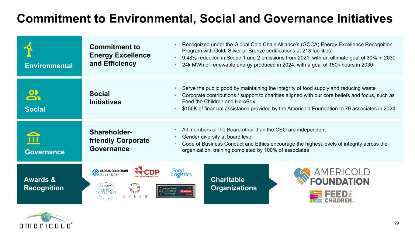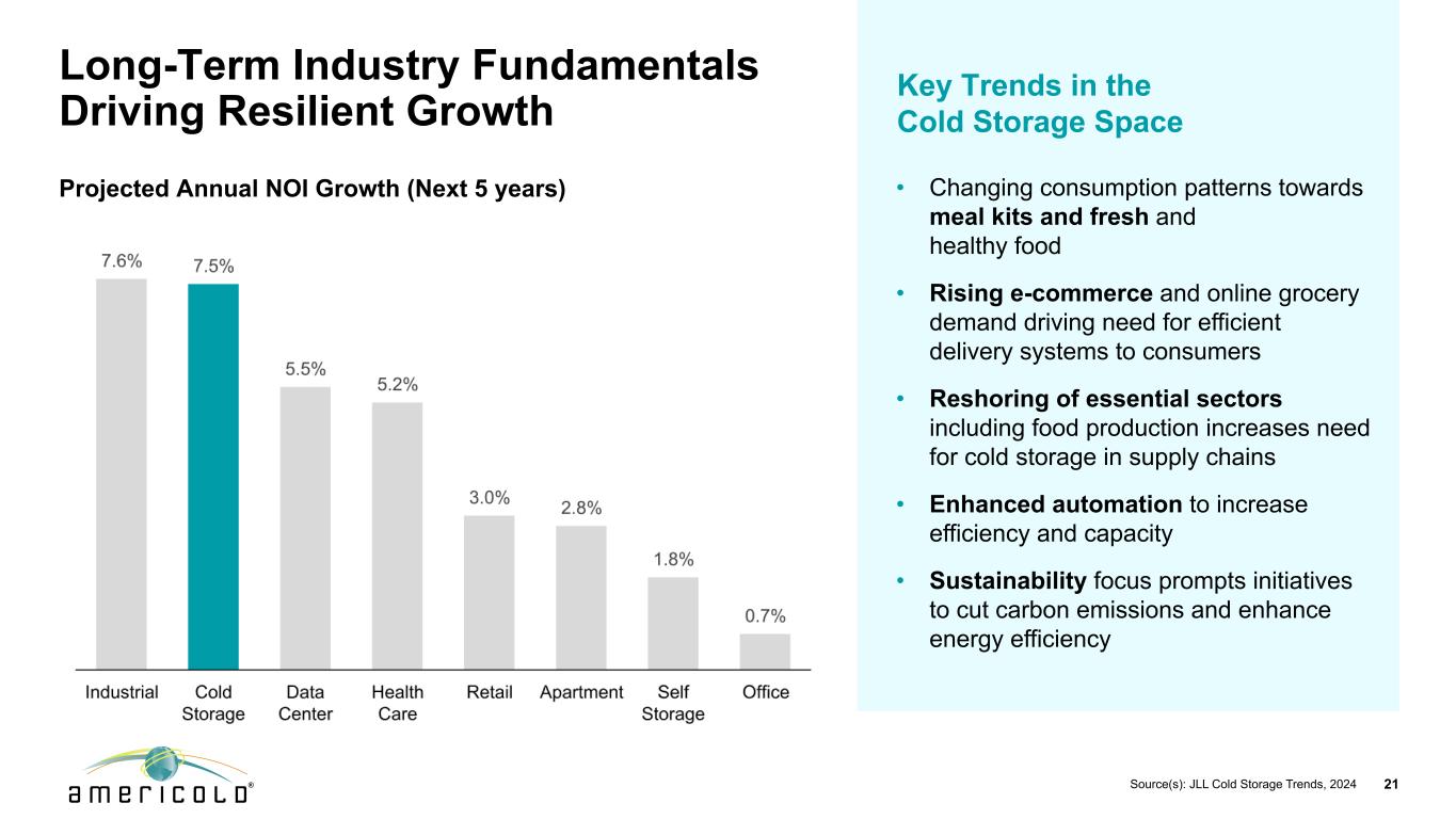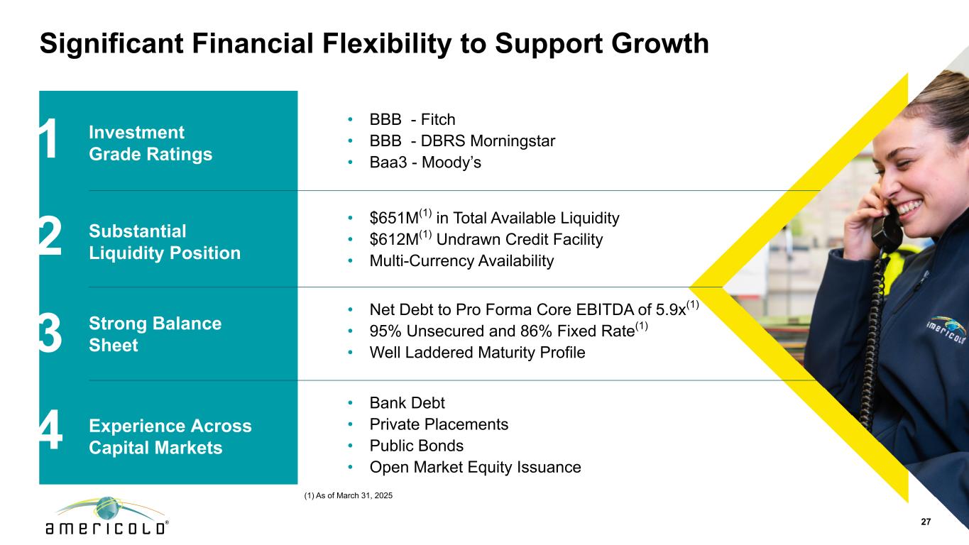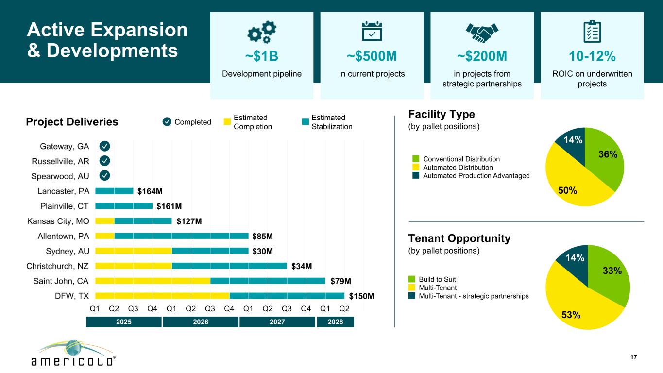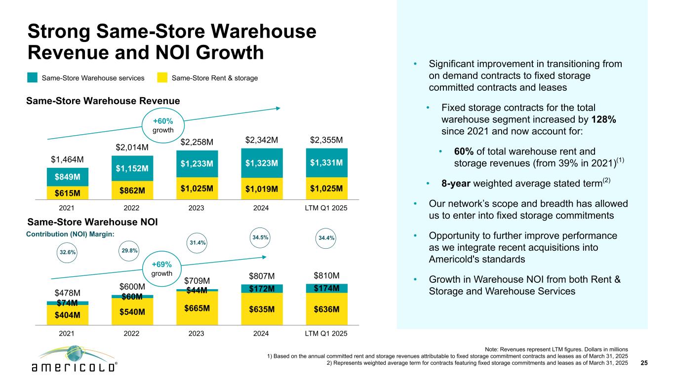 免责声明本演示文稿包含有关未来事件和预期的陈述,这些陈述构成前瞻性陈述。前瞻性陈述基于我们对未来财务和经营业绩及增长计划的信念、假设和预期,并考虑到我们目前可获得的信息。这些陈述不是历史事实的陈述。前瞻性陈述涉及风险和不确定性,可能导致我们的实际结果与我们在任何前瞻性陈述中表达或暗示的对未来结果的预期存在重大差异,您不应过分依赖此类陈述。可能导致这些差异的因素包括:国家、国际、区域和地方经济状况,包括贸易争端和对进口到美国的商品和出口到其他国家的商品征收关税的影响和不确定性;经济放缓或衰退时期;供应链中断的影响,其中包括劳动力供应、原材料供应、制造以及食品生产和运输的影响,以及;与公共卫生危机、我们的地理市场或温控仓库行业的不利经济或房地产发展相关的不确定性和风险;一般经济状况;收购风险,包括未能识别或完成有吸引力的收购,或收购未能按照预测履约,或我们未能从我们的收购中实现预期收益,包括协同效应,或我们的计划和运营中断,或与我们的收购相关的未知或或有负债;与现有物业的扩张和新物业的开发相关的风险,包括未能在预期时间范围内或根本无法达到预算或稳定的回报;我们的信息技术系统出现故障、系统转换和集成、网络安全攻击或我们的信息安全系统遭到破坏,网络或流程可能导致业务中断或机密信息丢失;与隐私和数据安全问题相关的风险,以及数据收集和传输限制和相关外国法规;重大客户合同违约或不续签;鉴于我们客户合同的性质,收入的不确定性;利率和运营成本增加;我们未能以有吸引力的条款或根本无法获得必要的外部融资;与以下相关的风险或包含的限制,我们的债务融资;储存率下降或空置率增加;与当前和潜在的国际业务和物业相关的风险;难以将我们的业务扩展到新市场,包括国际市场;与物业的部分所有权相关的风险,包括由于我们对此类投资缺乏控制以及此类实体未能按照预测履行职责;我们未能保持我们作为房地产投资信托基金(“REIT”)的地位;可能的环境负债,包括成本,因对我们目前或以前拥有的财产的污染进行必要的补救而可能产生的罚款或处罚;金融市场波动;我们的竞争对手的行为及其与我们竞争的能力不断增强;地缘政治冲突,例如俄罗斯和乌克兰之间的持续冲突或中东冲突死灰复燃;通货膨胀和利率上升;劳动力和电力成本;劳动力短缺;适用的政府法规和税收立法的变化,包括在国际市场;与增加欧洲业务和物业有关的额外风险;房地产和分区法律的变化以及房地产税率的提高;我们与我们的员工的关系;根据我们的集体谈判协议和与雇佣相关的诉讼发生任何停工或任何纠纷;由于我们参与多雇主养老金计划而产生的责任;未投保的损失或超出我们保险范围的损失;潜在的责任,与我们的内部卡车运输服务相关的成本和监管影响,以及与使用第三方卡车运输服务提供商向我们的客户提供运输服务相关的潜在中断;由于我们作为公开交易的房地产投资信托基金的运营而产生的成本和时间要求;外币汇率的变化;我们的组成文件和马里兰州法律中的反收购条款的影响,这可能会使收购我们变得更加困难,限制我们的股东试图更换我们的董事并影响我们的实益权益普通股的价格, 每股面值0.01美元;或我们的普通股发行的潜在稀释效应,包括我们正在进行的上市计划。“预期”、“相信”、“继续”、“估计”、“预期”、“目标”、“目标”、“打算”、“可能”、“机会”、“计划”、“潜力”、“近期”、“长期”、“预测”、“假设”、“项目”、“指导”、“预测”、“展望”、“目标”、“趋势”、“应该”、“可能”、“将”等词语和类似表述旨在识别此类前瞻性陈述,尽管并非所有前瞻性陈述都可能包含此类词语。本演示文稿中包含的前瞻性陈述示例包括,除其他外,关于我们预期的扩张和发展管道以及我们在扩张和发展机会方面的目标投资资本回报率的陈述。我们完全根据这些警示因素来限定任何前瞻性陈述。其他风险、不确定性和因素,包括我们截至2024年12月31日止年度的10-K表格年度报告中“风险因素”下讨论的风险、不确定性和因素,以及我们向美国证券交易委员会提交的其他报告,可能导致我们的实际结果与我们所做的任何前瞻性陈述中预测的结果存在重大差异。我们不承担以任何理由更新或修改这些前瞻性陈述的义务,或更新实际结果可能与这些前瞻性陈述中的预期存在重大差异的原因,即使未来有新信息可用,但法律要求的范围除外。非GAAP指标本演示文稿包含非GAAP财务指标,包括AFFO、核心EBITDA、核心EBITDA利润率、备考(“PF”)核心EBITDA、净债务与备考核心EBITDA、NOI和利润率、固定货币基础和维持资本支出。这些非GAAP指标的定义和与其最具可比性的GAAP指标的对账包含在我们于2025年5月8日向SEC提交的截至2025年3月31日止三个月的季度财务补充文件中。本演示文稿中包含的这些非公认会计原则措施中的每一项作为分析工具都有局限性,不应孤立地考虑或替代根据公认会计原则计算的公司结果分析。此外,由于并非所有公司都使用相同的计算方法,公司在本演示文稿中对非GAAP衡量标准的表述可能无法与包括其他REITs在内的其他公司披露的类似标题的衡量标准进行比较。2