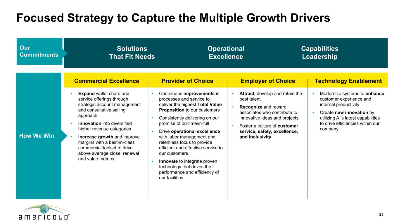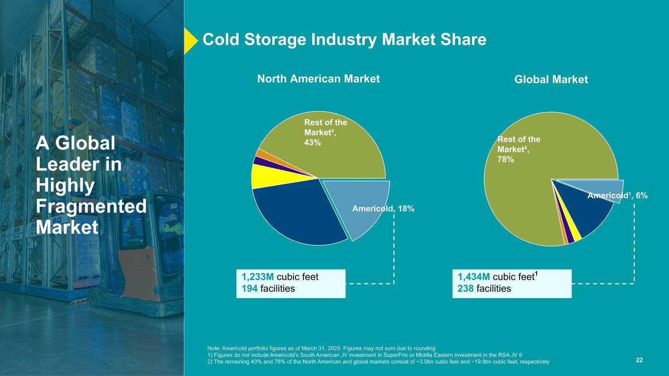 22温控仓储冷库行业的全球领导者市场份额1,233m立方英尺194设施1,434m立方英尺1 238设施注:截至2025年3月31日的Americold投资组合数据。由于四舍五入,数字可能未加总1)数字不包括Americold对SuperFrio的南美合资企业投资或对RSA合资企业的中东投资62)北美和全球市场剩余的43%和78%分别由约30亿立方英尺和约199亿立方英尺组成,分别是高度分散市场的全球领导者全球市场Americold丨,6%的其他市场²,78%的北美市场Americold,18%的其他市场²,43%