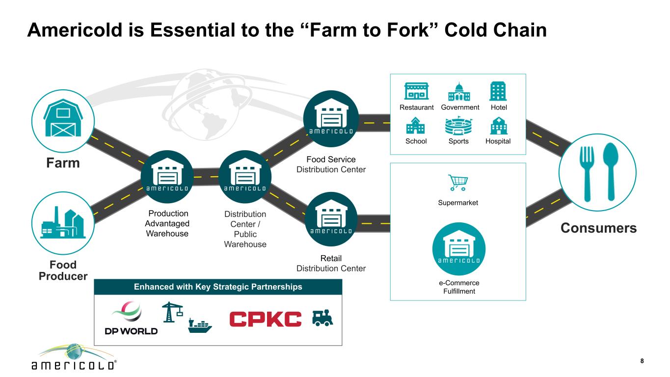 Americold必不可少“农转叉”冷链8生产优势仓配送中心/公仓零售配送中心餐厅学校医院酒店体育政务消费者增强与重点战略合作伙伴关系超市电商履约农家食品生产者食品服务配送中心