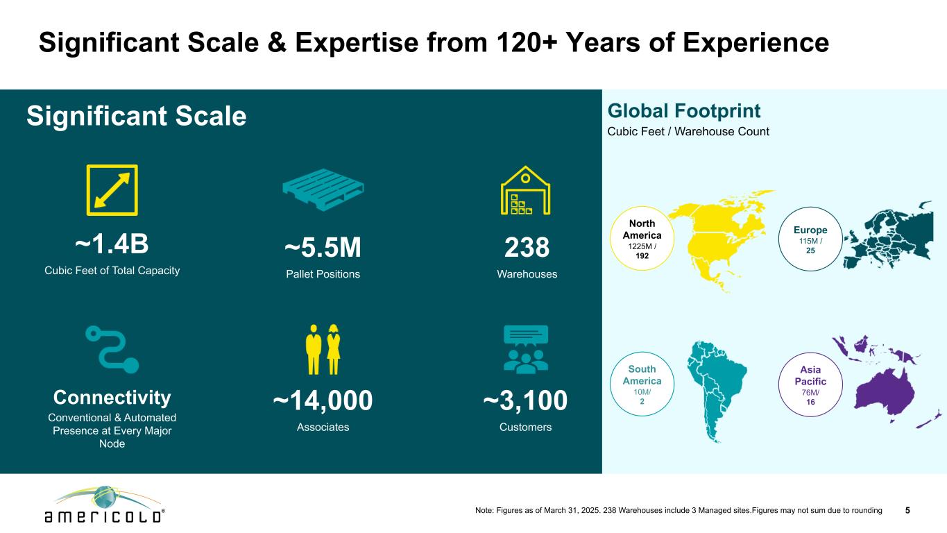 3以解决方案、卓越运营和经验丰富的领导力为中心的以执行为重点和定位良好的战略4多个增长动力,资本配置战略得到蓝筹客户群、独特的合作伙伴关系和强大的财务状况的支持Americold –令人信服的增长机会1具有吸引力的冷库行业的全球领导者,拥有高质量、战略位置的关键任务仓库的综合网络312独特的价值主张,具有无与伦比的专业知识、与行业专家的合作伙伴关系、可扩展的基础设施以及领先的技术和操作系统