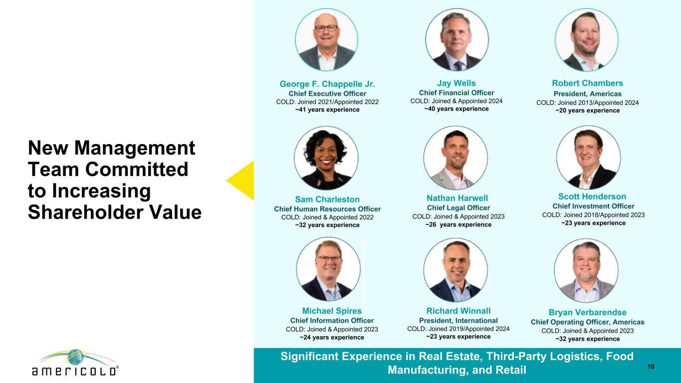 10名新管理团队致力于增加股东价值丨杰伊·威尔斯Jay Wells首席财务官 COLD:加入&任命2024~40年经验丨小乔治·查佩尔George F. Chappelle Jr.丨首席执行官COLD:加入2021/任命2022~41年经验Robert Chambers美洲总裁COLD:加入2013/任命2024~20年经验Sam Charleston首席人力资源官COLD:加入&任命2022~32年经验Richard Winnall总裁,International COLD:加入2019年/被任命2024~23年经验Scott Henderson首席投资官COLD:加入2018年/被任命2023~23年经验Nathan Harwell首席法务官COLD:加入并被任命2023~26年经验Michael Spires首席信息官COLD:加入并被任命2023~24年经验Bryan Verbarendse美洲首席运营官COLD:加入并被任命2023~32年在房地产、第三方物流、食品制造和零售领域拥有丰富经验