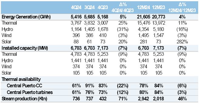 下表列出了与2024年第三季度以及2023年第四季度和2024财年相比,Central Puerto集团在2024年第四季度的主要运营指标: