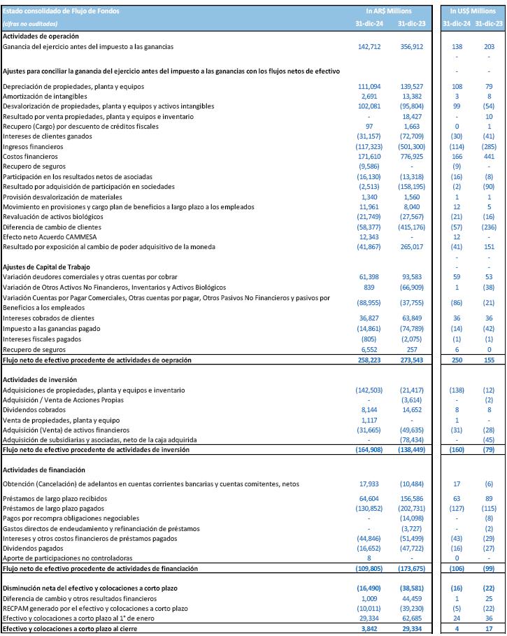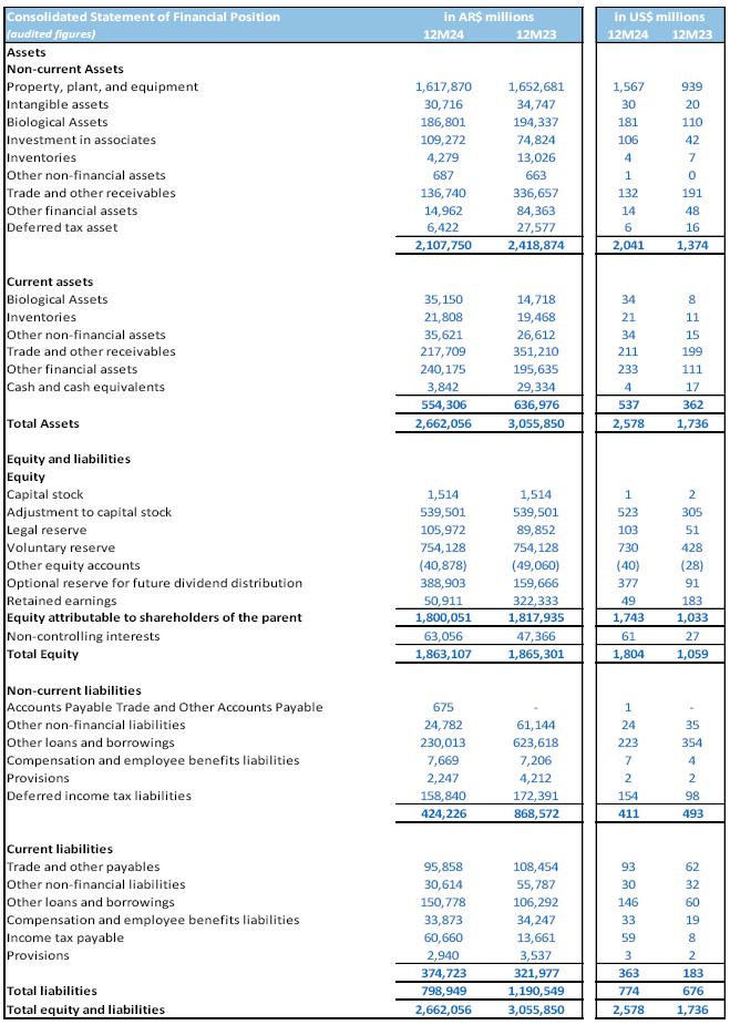 截至2024年12月31日的财务报表包括通货膨胀调整的影响,适用国际会计准则第29号。因此,财务报表已按报告期末的现行计量单位列报,包括为比较目的而报告的以往各期的相应财务数字。增长比较指上年同期,期末以当期单位计量,另有说明的除外。因此,截至2024年12月31日的财政年度财务报表中包含的信息与该公司此前发布的财务报表不具有可比性。然而,我们提供了一些从阿根廷比索转换成美元的数字,仅供比较之用。阿根廷比索兑换美元所采用的汇率为各期末央行报告的美元参考汇率(通信“A”3500)。以美元提供的信息仅为方便读者,如果每一期的这种转换是按照最近一期结束时适用的汇率进行的,则可能会推迟。您不应将这些换算视为阿根廷比索金额实际上代表这些美元金额或可以按所示汇率转换为美元的表示。
