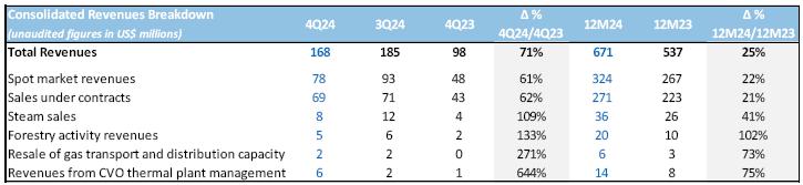 关于可再生能源发电,结果喜忧参半。风力发电量下降3%,与2023年同期的410GWh相比,在4Q24达到396GWh。这一下降主要是由于风资源减少以及一些维护工程。另一方面,太阳能发电量在2024年第四季度达到88GWh,而2023年同期为73GWh,这主要是由于更高的资源可用性。今年是这一发电设施第一个完整的12个月全面运行期。