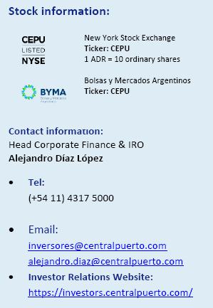 Central Puerto定期在其网站www.centralpuerto.com的投资者关系支持部分为投资者发布重要信息。有时,Central Puerto可能会使用其网站作为分发重要公司信息的渠道。因此,投资者除了关注公司的新闻稿、SEC文件、公开电话会议和网络广播外,还应关注Central Puerto的投资者关系网站。本公司网站所载或可透过本公司网站查阅的资料并无以引用方式并入本新闻稿,亦不是本新闻稿的一部分。