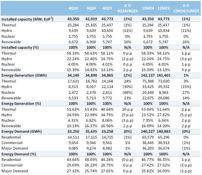 发电&需求:在24年第四季度,能源需求达到33,250 GWh,较24年第四季度录得的33,258 GWh略有下降。住宅消费下降1%,几乎被商业(+ 1%)和主要需求(+ 1%)所抵消。与2023年同月相比,2024年10月录得的较高气温促使零售消费增加,由于与2023年同月相比气温较温和,零售消费在11月和12月出现萎缩。