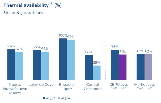 与2023年第四季度相比,2024年第四季度的热力发电量增长了25%,从3,007吉瓦时达到3,767吉瓦时。增长主要是由于波多黎各场址的一些蒸汽轮机和Luj á n de Cuyo的一些蒸汽和燃气轮机的调度增加,以及准将洛佩斯开放循环和圣达菲联合循环的发电量增加。此外,位于Costanera站点的三菱联合循环记录了更高的可用性和发送量。在本季度,对蒸汽轮机和联合循环进行了一些维护计划。值得一提的是,联合循环中执行的那些位于Nuevo Puerto(Puerto站点);三菱联合循环的一个单元,位于Costanera站点和Puerto站点的一些蒸汽轮机。