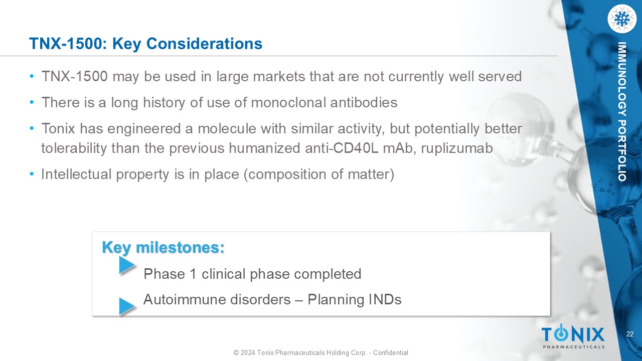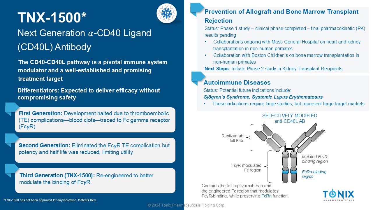 ©2024 Tonix Pharmaceuticals Holding Corp. TNX-1500*下一代β-CD40 Ligand(CD40L)抗体CD40-CD40L通路是一种关键的免疫系统调节剂,也是一个公认且有前景的治疗靶点第一代:由于血栓栓塞(TE)并发症——血栓——追踪到FC γ受体(FC R)预防同种异体移植物和骨髓移植排斥而停止了开发状态:1期研究–临床阶段已完成–最终药代动力学(PK)结果待定•与大众总医院正在进行的关于心脏的合作和非人类灵长类动物的肾移植•与波士顿儿童公司合作进行非人类灵长类动物的骨髓移植下一步:在肾移植受者中启动2期研究选择性修改的抗-CD40L AB鲁普利单抗全FAB包含全ruplizumab FAB和调节FC γ R结合的工程化FC区,同时保留FCRN功能。突变的FC γ R-结合区FCRN-结合区FC γ R-调制的FC区第二代:消除了FC RTE并发症但降低了效力和半衰期,限制了效用第三代(TNX-1500):重新设计以更好地调节FC R的结合。*TNX-1500没有被批准用于任何适应症。申请的专利。Differentiators:有望在不影响安全性的情况下提供疗效自身免疫性疾病现状:未来潜在的适应症包括:Sj ö gren综合征、系统性红斑狼疮•这些适应症需要大量研究,但代表了较大的目标市场