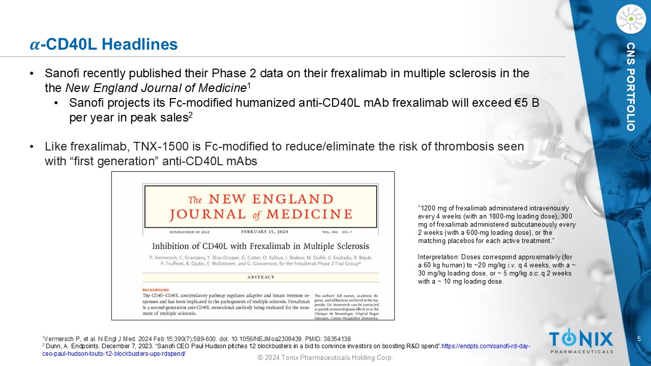 5©2024年Tonix Pharmaceuticals Holding Corp. CNS PortFOLIO-CD40L头条新闻• 赛诺菲最近在《新英格兰医学杂志》上发表了他们的frexalimab治疗多发性硬化症的2期数据1 • 赛诺菲预计,其FC-修饰的人源化抗CD40L单抗frexalimab在销售峰值时将超过每年5欧元B 2 •与frexalimab一样,TNX-1500经过FC-修饰以降低/消除“第一代”抗CD40L MABs 1 Vermersch P所见的血栓形成风险,et al. N Engl J Med. 2024 Feb15;390(7):589-600。doi:10.1056/NEJMoa2309439。PMID:383541382 Dunn,A.终点。2023年12月7日。“赛诺菲首席执行官Paul Hudson推销了12个重磅炸弹,以期在提高ING研发支出方面说服投资者”。https://endpts.com/sanofi-rd-day-ceo-paul-hudson-touts-12-blocksters-ups-rdspend/“每4周静脉给药1200毫克frexalimab(1800-mg负荷剂量),每2周皮下给药300毫克frexalimab(600-mg负荷剂量),或每种积极治疗的匹配安慰剂。”解读:剂量大约对应(60公斤人体)~20mg/kg i.v.q4周,负荷剂量~30mg/kg,或~5mg/kg s.c.q2周,负荷剂量~10mg。