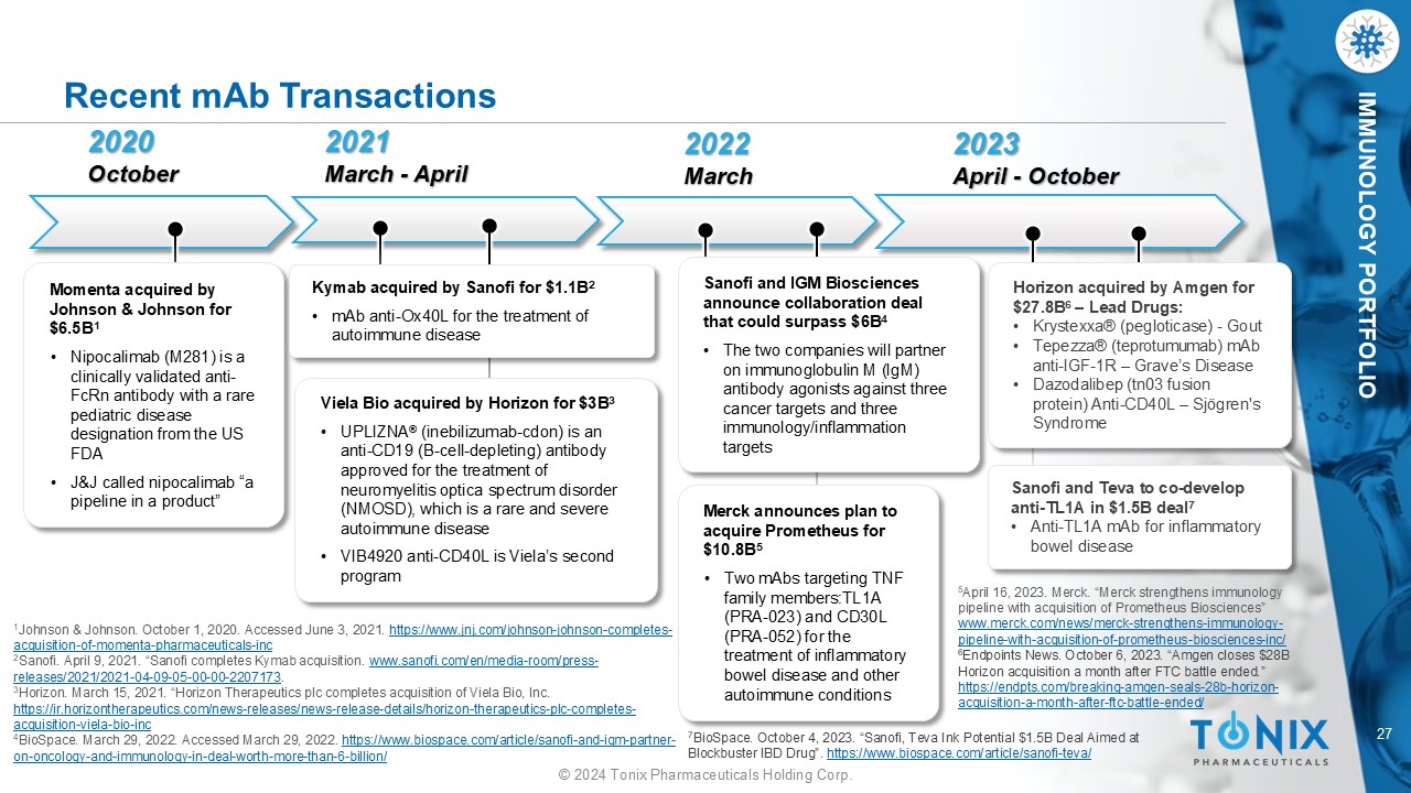 27©2024 Tonix Pharmaceuticals Holding Corp. IMMUNOLOGY PORTFOLIO 20202021年10月2021年3月-4月Momenta被强生以6.5B美元收购1 • Nipocalimab(M281)是一种经临床验证的抗FCRN抗体,具有美国FDA的罕见儿科疾病认定•强生称nipocalimab为“产品中的一条管道”,Horizon以3B美元收购的Viela Bio 3 • UPLIZNA®(inebilizumab-CDon)是一种抗CD19(B-消耗细胞)抗体,被批准用于治疗视神经脊髓炎谱系障碍(NMOSD),这是一种罕见的重症自身免疫性疾病• VIB4920抗CD40L是Viela的第二个项目Kymab,被赛诺菲以1.1B美元的价格收购2 • MAB抗Ox40L,用于治疗自身免疫性疾病1丨强生。2020年10月1日。2021年6月3日访问。https://www.jnj.com/johnson-johnson-完成-收购-momenta-pharmaceuticals-inc 2 赛诺菲。2021年4月9日。“赛诺菲完成对Kymab的收购。www.sanofi.com/en/media-room/press-releases/2021/2021-04-09-05-00-00-00-2207173。3地平线。2021年3月15日。“Horizon Therapeutics PLC完成对Viela Bio,Inc.的收购https://ir.horizontherapeutics.com/news-releases/news-release-details/horizon-therapeutics-plc-完成-收购-viela-bio-inc 4 BioSpace。2022年3月29日。3月29日访问,2022. https://www.biospace.com/article/sanofi-and-IGM-partner-on-oncology-and-immunology-in-deal-worth-more than-60-billion/recent mAB transactions 2022 March March 赛诺菲和IGM Biosciences宣布合作协议可能超过6B美元4 •两家公司将合作开发针对三个癌症靶点和三个免疫学/炎症靶点的免疫球蛋白M(IGM)抗体激动剂,Horizon被安进以27.8B美元的价格收购6 –先导药物:• Krystexxa®(pegloticase)-痛风• Tepezza®(teprotumumab)MAB抗IGF-1R – Grave’s Disease • Dazodalibep(tn03融合蛋白)抗CD40L – Sj ö gren综合征默沙东宣布计划以$ 10.8B收购Prometheus 5 •两款靶向TNF家族成员的MAB:TL1A(PRA-023)和CD30L(PRA-052)用于治疗炎症性肠病和其他自身免疫性疾病2023年4月-10月5日2023年4月16日。默沙东。“默沙东通过收购Prometheus Biosciences加强免疫学管道”www.merck.com/news/merck-加强-免疫学-管道-与-收购-prometheus-biosciences-inc/6 Endpoints News。2023年10月6日。“在FTC之争结束一个月后,安进完成了28B美元的Horizon收购。”https://endpts.com/breaking-amgen-seals-28b-horizon-acquisition-a-month-after-fTC-battle-ended/赛诺菲和梯瓦将以1.5B美元的交易共同开发抗TL1A 7 •用于炎症性肠病的抗TL1A mAB 7 BioSpace。2023年10月4日。“赛诺菲与Teva Ink Potential达成1.5B美元的交易,瞄准重磅IBD药物”。https://www.biospace.com/article/sanofi-teva/