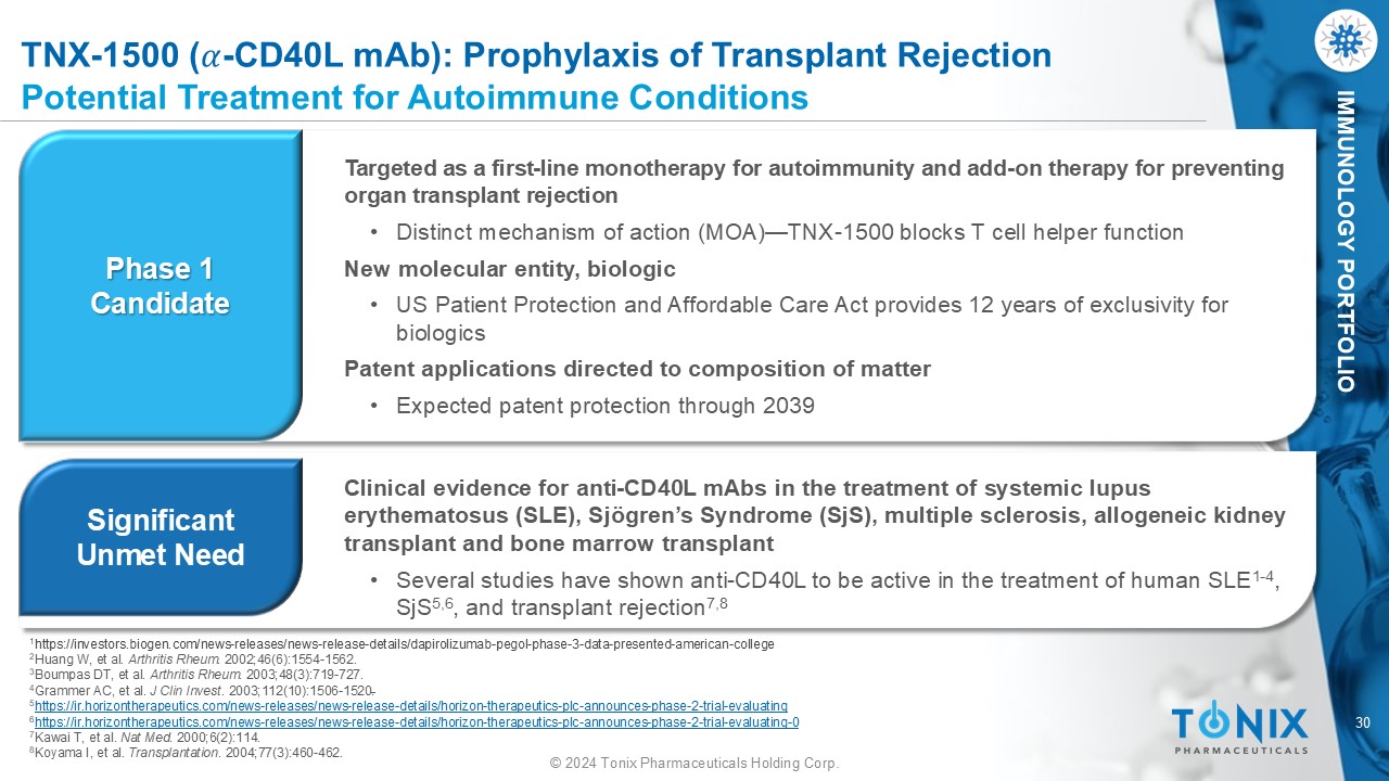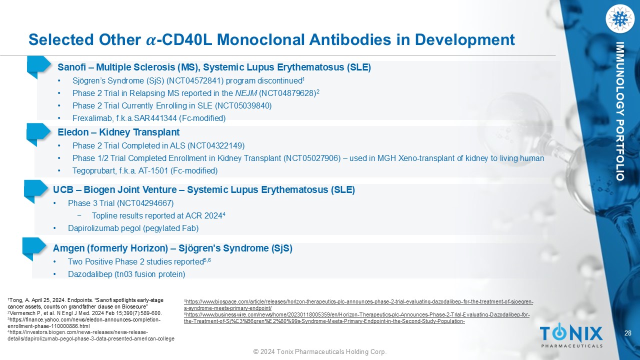 28©2024年Tonix Pharmaceuticals Holding Corp.免疫学投资组合选定其他-CD40L单克隆抗体在研丨赛诺菲丨–多发性硬化症(MS)、系统性红斑狼疮(SLE)• Sj ö gren综合征(SJS)(NCT04572841)项目终止1 • NEJM(NCT04879628)报告的复发MS的2期试验2 •目前在SLE中注册的2期试验(NCT05039840)• Frexalimab,f.k.a。SAR441344(FC-修改)Eledon –肾移植• ALS中的2期试验完成(NCT04322149)•肾移植中的1/2期试验完成入组(NCT05027906)–用于MGH Xeno-活人肾移植• T egoprubart,F.K.a。AT-1501(FC-修改)1 Tong,A.2024年4月25日。终点。“赛诺菲聚焦早期癌症资产,指望BioSecure上的爷爷条款”2 Vermersch P,et al. N Engl J Med. 2024 Feb 15;390(7):589-600。3 https://finance.yahoo.com/news/eledon-announces-completion-enrollment-phase-110000886.html 4 https://investors.biogen.com/news-releases/news-release-details/dapirolizumab-pegol-phase-3-data-presented-American-college UCB – 渤健合资企业–系统性红斑狼疮(SLE)• 3期试验(NCT04294667)− ACR 2024上报告的顶线结果4 • dapirolizumab pegol(pegylated fab)安进(原Horizon)– Sj ö gren综合征(SJS)•两项阳性2期研究报告5,6 • Daz试验-评估-Dazodalibep-for-the-treatm ent-of-sjoegren-s-syndrome-meets-primary-endpoint/6 https://www.businesswire.com/news/home/20230118005359/en/Horizon-Therapeutics-plc-announces-phase-2-trial-evaluating-Dazodalibep-for-the-treatment-of-sj % c3 % b6gren % e2 % 80% 99s-syndrome-meets-primary-endpoint-in-the-second study-population-