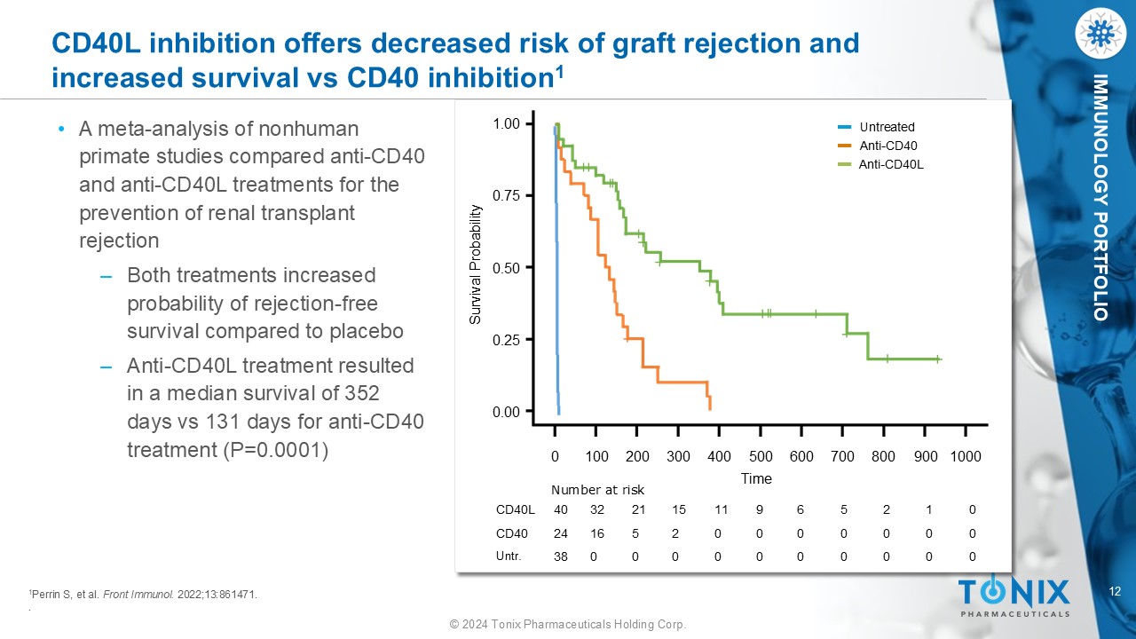 11©2024 Tonix Pharmaceuticals Holding Corp.免疫组合CD40L是CD40和CD11b的CD40 B细胞活化CD4 + T细胞抗CD40L •抗CD40L抗体均可提供阻断与CD40和CD11b抗CD40相互作用的优势•阻断CD40L和CD11b的相互作用可增强抗CD40治疗延长同种异体移植物存活率的功效1 ——抗CD40抗体阻断CD40/CD40L结合,但不影响CD11b/CD40L结合11刘D等AM J移植。2020;202216 - 2225. .活化抗原呈递细胞CD11b活化内皮细胞CD40 CD11b CD40 CD40L