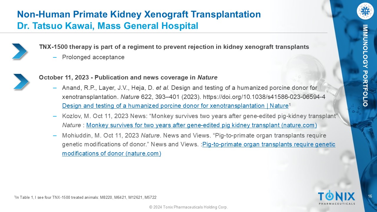 15©2024年Tonix Pharmaceuticals Holding Corp.免疫组合非人类灵长类动物心脏异位同位异位基因移植1 Richard Pierson博士,麻省总医院TNX-1500单药治疗始终防止心脏移植排斥反应1 ——在先前研究的治疗阶段停止治疗(进行中)后延长接受与嵌合hu5c8 2类似的活性—— FC-修饰的TNX-1500 mAB没有明显的效应功能丧失2023年4月发表:—— Miura,S.等人(2023)TNX-1500,一种FC-修饰的抗-CD154抗体,可延长非人类灵长类动物心脏同种异体移植物的生存期。American Journal of Transplantation 11 Miura,S.等人(2023)TNX-1500,一种FC-修饰的抗-CD154抗体,可延长非人类灵长类动物心脏同种异体移植物的生存期。美国移植杂志。2023年4月7日。https://doi.org/10.1016/j.ajt.2023.03.025.www.sciencedirect.com/science/article/pii/S1600613523003969 2小鼠-人IgG1 α嵌合抗-CD154