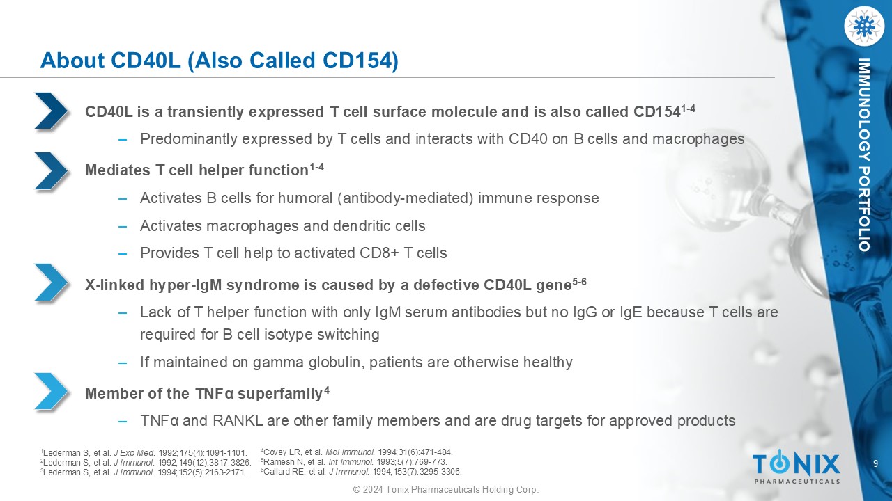 8©2024年Tonix Pharmaceuticals Holding Corp.免疫投资组合TNX-1500(-CD40 Ligand)市场机会自身免疫性疾病1494亿美元6机会肾移植:2.4万/年/2美元55.4亿美元3自身免疫性狼疮:美国150万患者418.7亿5器官移植排斥药物47亿美元11截至2018年全球市场(https://www.biospace.com/article/organ-transplant-排斥-药物-市场-药物公司-专注-改善-长期-结果-新药/)2 Wang,Jeffrey H.和Hart,Allyson。Kidney3602021年11月;2(11)1836-1839 3截至2020年全球市场(https://www.grandviewresearch.com/industry-analysis/transplantation-market)4 https://www.lupus.org/resources/lupus-事实-和-统计数据5全球市场截至2020年(https://www.globenewswire.com/news-release/2021/02/18/2177637/0/en/Global-Lupus-Therapeutics-Market-is-expected-to-reach-USD-3-62-billion-by-2028-fior-markets.html)6预计到2025年的市场规模(https://www.prnewswire.com/news-release/the-global-autoimmunit-disease-therapeutics-market-size-is-expected-to-reach-149-40-billion-by-2025-rising-at-a-market-growth-of-4-34-cagr-during期-300902336.html)