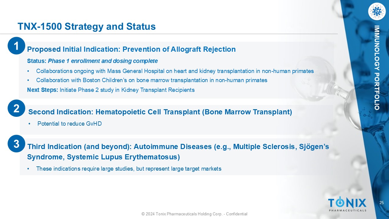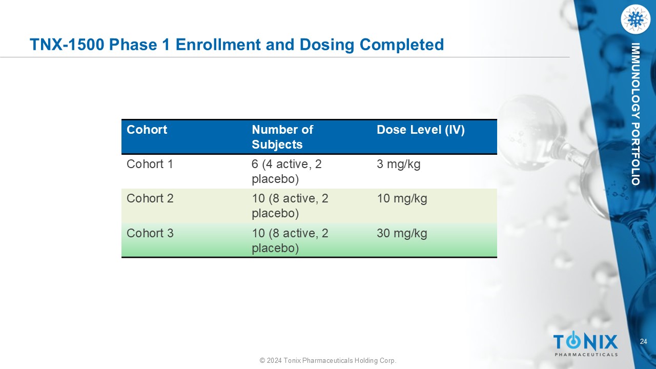 24©2024年Tonix Pharmaceuticals Holding Corp.免疫投资组合TNX-1500期1入组和给药完成剂量水平(IV)受试者数量队列3mg/kg 6(4个有效,2个安慰剂)队列110mg/kg 10(8个有效,2个安慰剂)队列230mg/kg 10(8个有效,2个安慰剂)队列3