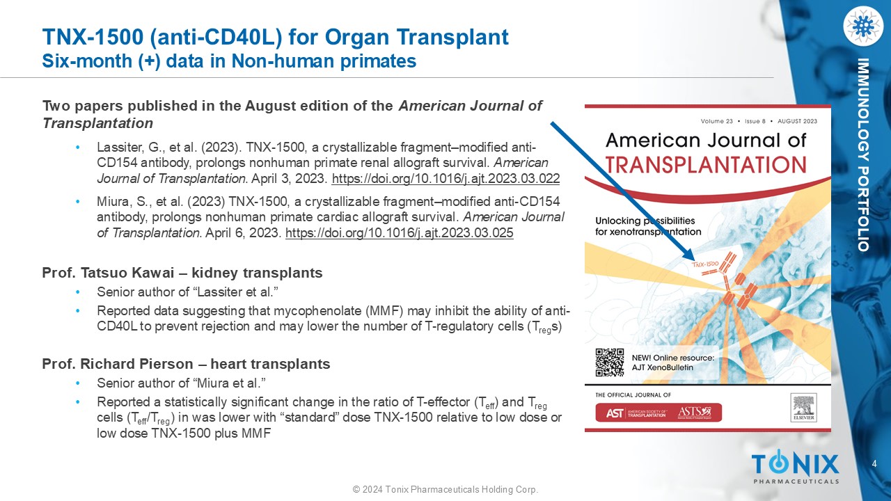 4©2024年Tonix Pharmaceuticals Holding Corp.免疫组合TNX-1500(anti-CD40L)用于非人灵长类动物器官移植的六个月(+)数据两篇论文发表在美国移植杂志• Lassiter,G.,et al.(2023)8月版上。TNX-1500,一种可结晶的片段–修饰的抗-CD154抗体,可延长非人灵长类动物肾同种异体移植物的存活率。美国移植杂志。2023年4月3日。https://doi.org/10.1016/j.ajt.2023.03.022 • Miura,S.,et al.(2023)TNX-1500,一种可结晶片段–修饰的抗-CD154抗体,可延长非人灵长类心脏同种异体移植物的存活率。美国移植杂志。2023年4月6日。https://doi.org/10.1016/j.ajt.2023.03.025Prof. Kawai Tatsuo –肾移植•《Lassiter et al.》资深作者。•报告的数据表明,霉酚酸酯(MMF)可能会抑制抗CD40L预防排斥的能力,并可能降低T调节细胞(T reg s)的数量Richard Pierson教授–心脏移植•“Miura等人”的资深作者。•报告“标准”剂量TNX-1500相对于低剂量或低剂量TNX-1500加MMF的T-效应(T eff)和T reg细胞(T eff/T reg)的比率有统计学意义的变化