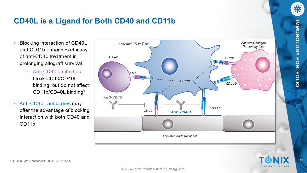 10©2024 Tonix Pharmaceuticals Holding Corp. IMMUNOLOGY PORTFOLIO第三代α-CD40L Engineered to Reduce Risk of Thrombosis第一代抗-CD40L MABs恒定片段(FC)结构域与FC γ RIIA(CD32A)相互作用,这表明了血栓形成风险增加的机制。1,2 Ruplizumab第二代抗CD40L蛋白第二代抗CD40L蛋白与FC γ RIIA 3-6的结合显着降低,但存在其他问题,包括疗效下降、半衰期缩短或产生抗药物抗体(ADAs)。7-9达匹罗利珠单抗来托利珠单抗阿糖基鲁普利单抗第三代抗CD40L单抗*TNX-1500被设计用于治疗靶向CD40L,同时减少FC γ RIIA结合,从而降低血栓形成的可能性。1-9 TNX-1500*赛诺菲的frexalimab(原SAR441344)和Eledon的tegoprubart(原AT-1501)也是FC修饰的1 Inwald DP,et al. Circ RES. 2003;92(9):1041-1048。2 Robles-Carrillo L,et al. J Immunol。2010;185(3):1577 - 1583.3 Shock A,et al.关节炎复发。2015;17(1):234.4 Xie JH,et al. J Immunol。2014;192(9):4083 - 4092.5 Ferrant JL,et al. Int Immunol。2004;16(11):1583 - 1594.6 Karnell JL,et al. Sci Transl Med. 2019;11(489):eaar6584。7 ClinicalTrials.gov标识符:NCT02273960。2019年7月16日更新。2021年6月1日访问。https://clinicaltrials.gov/ct2/show/results/NCT02273960?view=results 8 Waters J,Biocentury;(2018年)10月26日。9公司数据。Dazodalibep