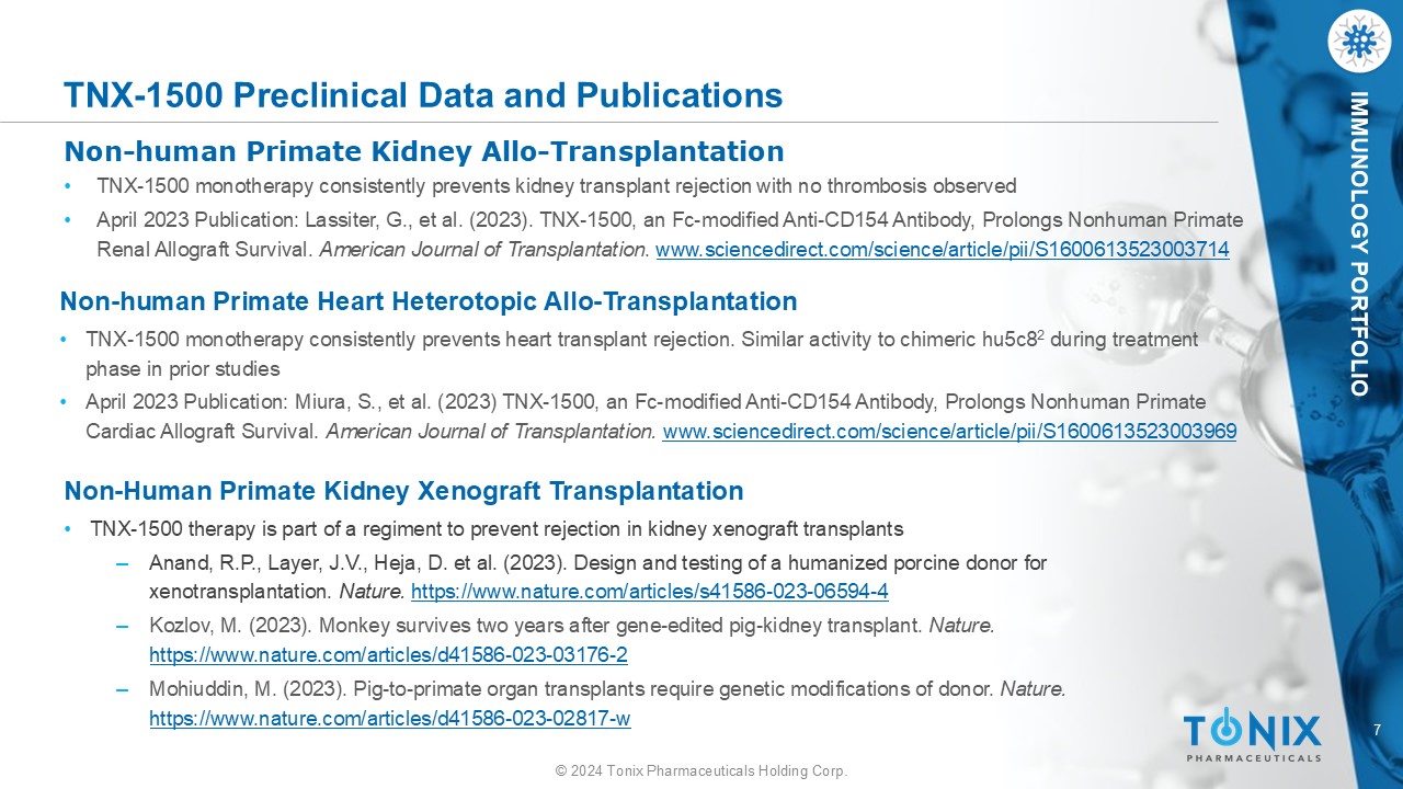 6©2024年Tonix Pharmaceuticals Holding Corp. CNS投资组合-CD40L头条新闻•麻省总医院刚刚将一个基因工程猪肾移植到活人身上1 •波士顿环球报,2024年3月21日• 2024年5月11日宣布患者死亡2 •该患者正在接受来自Eledon 1的抗-CD40L mAB tegoprubart治疗•一些临床前工作是使用TNX-1503 • Mass General计划在研究者发起的IND 1麻省总医院新闻稿下使用TNX-1500进行同种异体肾移植。2024年3月21日。“世界上第一个基因编辑的猪肾移植成活体受者在麻省总医院进行。”www.massgeneral.org/news/press-release/worlds-first-基因编辑-猪肾移植成活体受者(2024年3月29日访问)2 Stoico,N. Boston Globe。2023年5月11日。“接受首例基因工程猪肾移植的Mass Man已经死亡,家人说”。3 Anand,R.P.,et al Nature。622,393 – 401(2023). https://doi.org/10.1038/s41586-023-06594-4