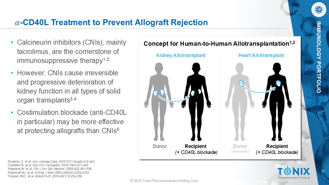 12©2024年Tonix Pharmaceuticals Holding Corp.免疫学组合CD40L抑制与CD40抑制相比可降低移植物排斥风险并提高生存率1 •非人类灵长类动物研究的meta分析比较了抗CD40和抗CD40L治疗预防肾移植排异-与安慰剂相比,两种治疗均增加了无排异生存期的概率-抗CD40L治疗导致中位生存期为352天vs 131天用于抗CD40治疗(P = 0.0001)生存概率时间1.00 0.75 0.50 0.25 0.00 0100200300400500600700800900100000125691115213240 CD40L 00000000251624 CD40 0000000038 Untr。Number at risk Untreated Anti-CD40 Anti-CD40L 1 Perrin S,et al. Front Immunol。2022;13:861471. .