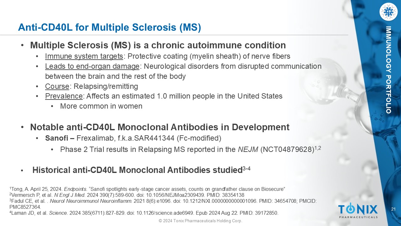 21©2024年Tonix Pharmaceuticals Holding Corp.免疫组抗CD40L治疗多发性硬化症(MS)•多发性硬化症(MS)是一种慢性自身免疫性疾病•免疫系统靶点:神经纤维的保护性涂层(髓鞘)•导致末端器官损伤:大脑与身体其他部位的通讯中断引起的神经系统疾病•疗程:复发/缓解•流行率:在美国估计影响100万人•更多见于女性•显着的抗CD40L单克隆抗体正在开发中•丨赛诺菲丨– Frexalimab,f.k.a. SAR441344(FC-修改)• NEJM(NCT04879628)中报告的复发MS的2期试验结果1,2 •研究的历史抗CD40L单克隆抗体3-4 1 Tong,A. 2024年4月25日。终点。“赛诺菲聚焦早期癌症资产,指望BioSecure上的爷爷条款”2 Vermersch P,et al. N Engl J Med. 2024390(7):589-600。doi:10.1056/NEJMoa2309439。PMID:383541383 Fadul CE,et al。Neurol Neuroimmunol神经炎。20218(6):e1096.doi:10.12 12/NXI.0000000000001096。PMID:34654708;PMCID:PMC8527364。4 Laman 京东,et al. Science。2024385(6711):827-829. doi:10.1126/science.ade6949。EPUP2024年8月22日。PMID:39172850。