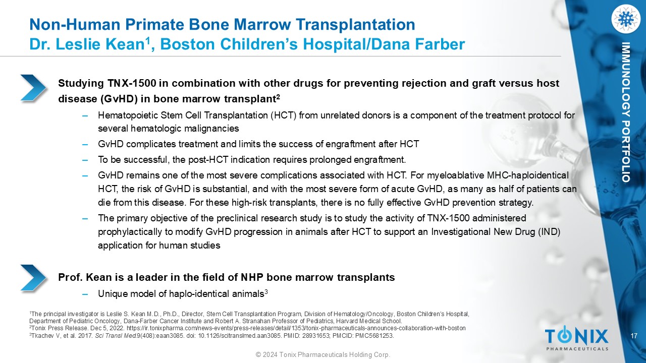 17©2024年Tonix Pharmaceuticals Holding Corp.免疫组合非人灵长类动物骨髓移植Leslie Kean 1博士,波士顿儿童医院/达纳 Farber研究TNX-1500联合其他药物预防骨髓移植中的排斥和移植物抗宿主病(GVHD)2 ——来自无关供体的造血干细胞移植(HCT)是几种血液系统恶性肿瘤治疗方案的组成部分—— GVHD使治疗复杂化,并限制了HCT后植入的成功——要想获得成功,HCT后的适应症需要延长植入时间。丨GVHD仍然是与HCT相关的最严重的并发症之一。对于清髓性MHC-半相合HCT,发生GVHD的风险很大,而对于最严重的急性GVHD形式,多达一半的患者可以死于这种疾病。对于这些高风险移植,没有完全有效的GVHD预防策略。丨临床前研究的主要目标是研究预防性给药的TNX-1500在HCT后改变动物GVHD进展的活性,以支持用于人体研究的研究性新药(IND)申请。Kean教授是NHP骨髓移植领域的领导者—— haPLO的独特模型-相同动物31主要研究者是Leslie S. Kean医学博士,波士顿儿童医院儿科肿瘤科血液科/肿瘤科干细胞移植项目主任,达纳-法伯癌症研究所和Robert A. Stranahan哈佛医学院儿科教授。2 Tonix新闻稿。2022年12月5日。https://ir.tonixpharma.com/news-events/press-releases/detail/1353/tonix-pharmaceutical-announ ces-cooperation-with-boston 3 tkachev V,et al. 2017。Sci Transl Med. 9(408):eaan3085.doi:10.1126/scitranslmed.aan3085。PMID:28931653;PMCID:PMC5681253。