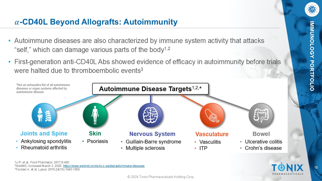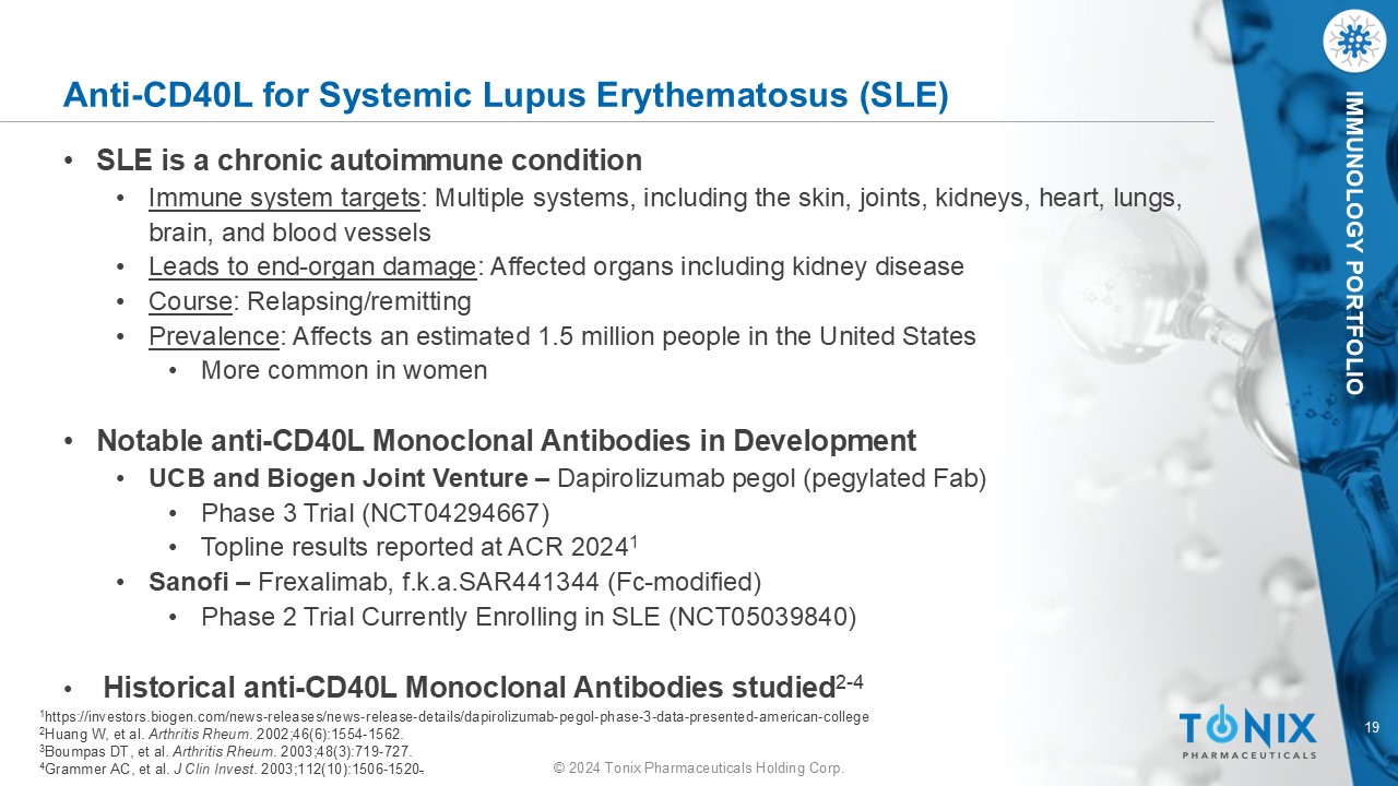 18©2024 Tonix Pharmaceuticals Holding Corp.免疫产品组合-CD40L Beyond Allografts:自身免疫•自身免疫性疾病的特征还在于攻击“自我”的免疫系统活动,它可以损害身体的各个部位1,2 •第一代抗CD40L ABS在试验因血栓栓塞事件而停止之前显示出自身免疫方面的有效性证据31 Li P等人的Front Pharmacol。2017;8:460.2 WebMD。2020年3月3日访问。https://www.webmd.com/a-to-z-guides/autoimmune-diseases 3 Tocoian A,et al. Lupus。2015;24(10):1045 - 1056.