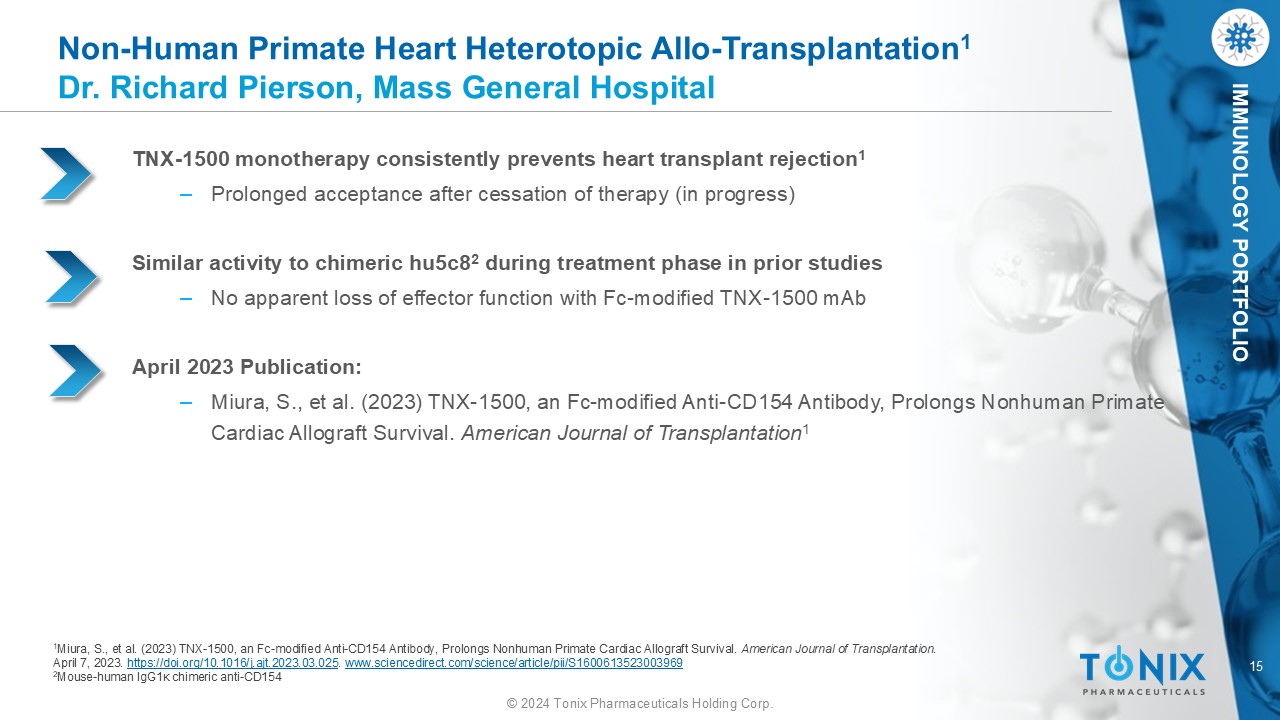 14©2024年Tonix Pharmaceuticals Holding Corp.免疫组合非人灵长类动物肾Allo-移植1麻省总医院TNX-1500单药治疗始终预防肾移植排斥的Kawai Tatsuo博士——优于常规三药免疫抑制方案2的结果,未观察到血栓形成——在2023年4月的先前研究中使用hu5c8观察到血栓形成发表于:丨Lassiter,G.,et al.(2023)。TNX-1500,一种FC-修饰的抗-CD154抗体,可延长非人灵长类动物肾脏同种异体移植物的存活率。美国移植杂志。11 Lassiter,G.,et al.(2023)。TNX-1500,一种FC-修饰的抗-CD154抗体,可延长非人灵长类动物肾脏同种异体移植物的存活期。美国移植杂志。2023年4月7日。https://doi.org/10.1016/j.ajt.2023.03.02 2.www.scienceDirect.com/science/article/pii/S1600613523003714 2他克莫司、MMF和类固醇