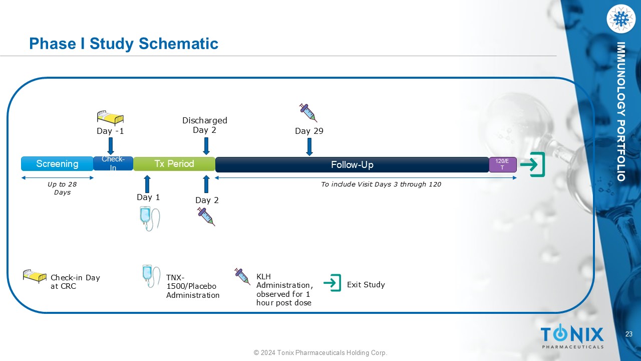 23©2024年Tonix Pharmaceuticals Holding Corp.免疫组合I期研究示意图日-1个TX期第1天筛查第2天打卡-最长28天随访-最高120/E T以包括探视第3天至120天出院第2天第29天在CRC TNX打卡-1500/安慰剂给药KLH给药,剂量退出研究后观察1小时