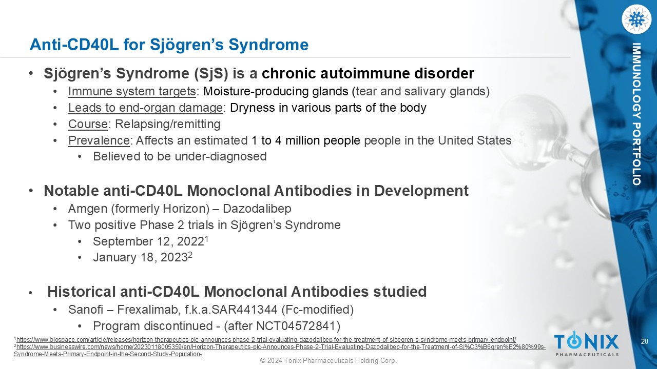 20©2024年Tonix Pharmaceuticals Holding Corp.免疫组合抗-CD40L治疗干燥综合征1 https://www.biospace.com/article/releases/horizon-therapeutics-plc-宣布-2期-试验-评估-dazodalibep-用于-the-treatm ent-of-sjoegren-s-综合征-符合-主要-终点/2 https://www.businesswire.com/news/home/20230118005359/en/horizon-Therapeutics-plc-宣布-2期-试验-评估-Dazodalibep-为-的-治疗-的-SJ % C3 % B6gren % E2 % 80% 99s-综合征-符合-主要-终点-在-第二-研究-人群-• Sj ö gren综合征(SJS)是一种慢性自身免疫性疾病•免疫系统靶点:产生水分的腺体(泪和唾液腺)•导致终末器官损伤:身体各部位干燥•历程:复发/缓解•流行率:在美国估计影响100-400万人•被认为诊断不足•正在开发的值得注意的抗CD40L单克隆抗体• 安进(原Horizon)– Dazodalibep •两项Sj ö gren综合征的阳性2期试验• 2022年9月12日1 • 2023年1月18日2•研究了历史上的抗CD40L单克隆抗体• 赛诺菲– Frexalimab,f.k.a. SAR441344(FC-修改)•程序中止-(NCT04572841后)