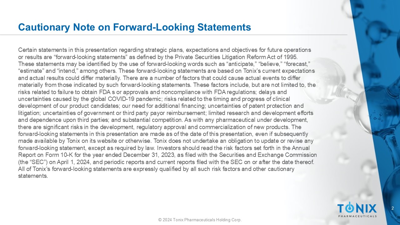 2©2024 Tonix Pharmaceuticals Holding Corp.关于前瞻性陈述的注意事项本演示文稿中有关未来运营或结果的战略计划、预期和目标的某些陈述是1995年《私人证券诉讼改革法案》定义的“前瞻性陈述”。这些陈述可以通过使用“预期”、“相信”、“预测”、“估计”和“打算”等前瞻性词语来识别。这些前瞻性陈述是基于Tonix目前的预期,实际结果可能存在重大差异。有许多因素可能导致实际事件与此类前瞻性陈述所表明的情况存在重大差异。这些因素包括但不限于与未能获得FDA的批准和不遵守FDA法规相关的风险;全球COVID-19大流行造成的延误和不确定性;与我们的候选产品临床开发的时间和进度相关的风险;我们对额外融资的需求;专利保护和诉讼的不确定性;政府或第三方付款人报销的不确定性;有限的研发努力和对第三方的依赖;以及实质性竞争。与任何在研药品一样,新产品的开发、监管批准和商业化都存在重大风险。本演示文稿中的前瞻性陈述是在本演示文稿发布之日作出的,即使随后由Tonix在其网站或其他网站上提供。除法律要求外,Tonix不承担更新或修改任何前瞻性陈述的义务。投资者应阅读2024年4月1日向美国证券交易委员会(“SEC”)提交的截至2023年12月31日止年度的10-K表格年度报告中列出的风险因素,以及在该日期或之后向SEC提交的定期报告和当前报告。Tonix的所有前瞻性陈述都明确受到所有此类风险因素和其他警示性陈述的限制。