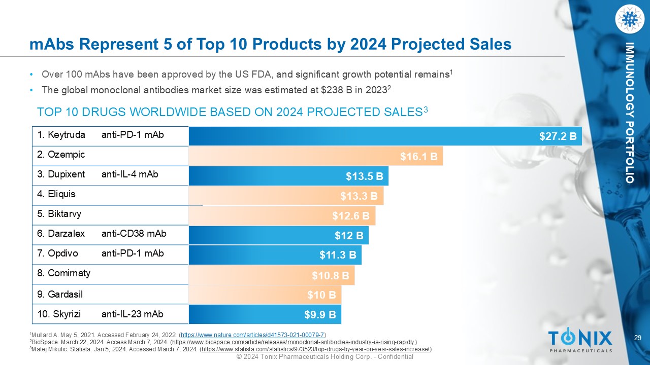 29©2024年Tonix Pharmaceuticals Holding Corp.-机密免疫组合单抗代表2024年预计销售额前10名产品中的5个•超过100个单抗已获得美国FDA批准,增长潜力仍然显着1 •根据2024年预计销售额31 Mullard A.,2023年全球单克隆抗体市场规模估计为238亿美元2全球排名前10的药物。2021年5月5日。于2022年2月24日访问。(https://www.nature.com/articles/d41573-021-00079-7)2生物空间。2024年3月22日。访问2024年3月7日。(https://www.biospace.com/article/releases/monoclonal-antibodies-industry-is-rising-rapidly)3 Matej Mikulic。Statista。202年1月5日4。于2024年3月7日访问。(https://www.statista.com/statistics/973523/top-drugs-by-year-on-year-sales-increase/)anti-PD-1 mAB 1。Keytruda 2。Ozempic抗IL-4 MAB3。Dupixent 4。Eliquis 5。Biktarvy抗-CD38单抗6。Darzalex抗PD-1单抗7。Opdivo 8。共9条。Gardasil抗IL-23 MAB 10。Skyrizi $ 27.2 b $ 16.1 b $ 13.3 b $ 13.5 b $ 12.6 b $ 12 b $ 11.3 b $ 10.8 b $ 10 b $ 9.9 b