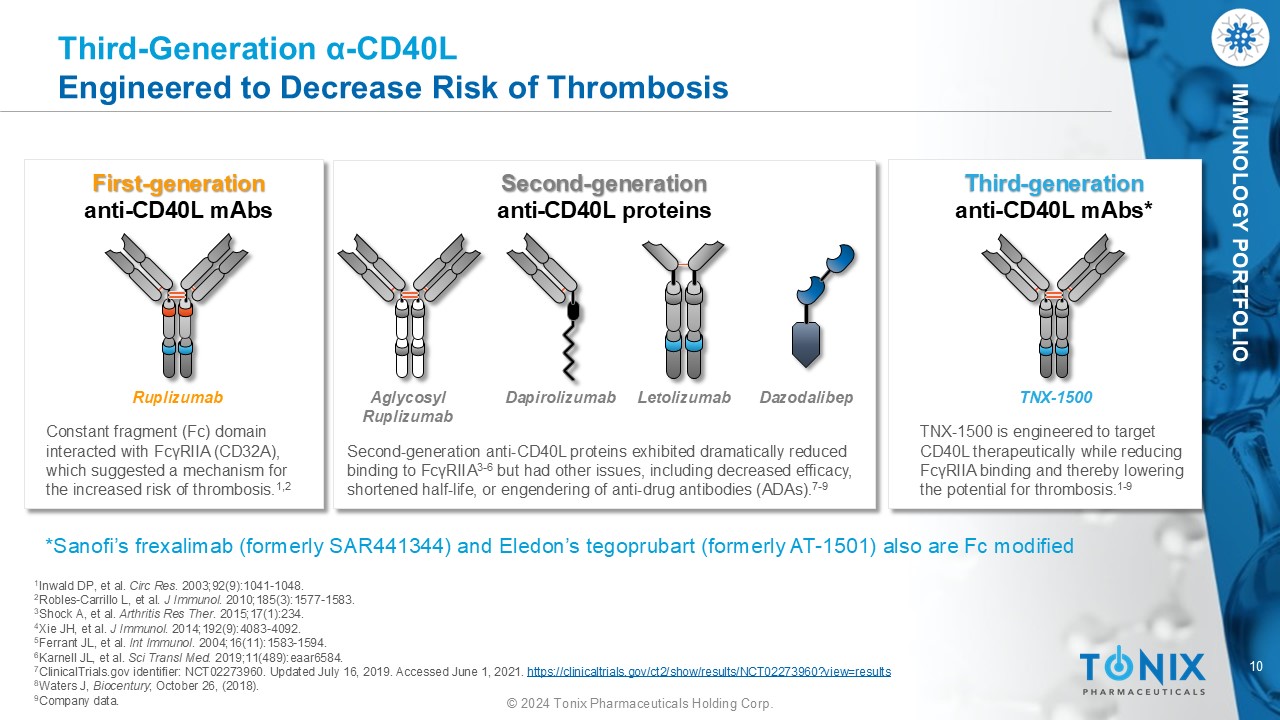 9©2024 Tonix Pharmaceuticals Holding Corp.关于CD40L(也称CD154)的免疫学产品组合CD40L是一种瞬时表达的T细胞表面分子,也称为CD154 1-4 ——主要由T细胞表达,并与B细胞上的CD40相互作用,巨噬细胞介导T细胞辅助功能1-4 ——激活B细胞进行体液(抗体介导的)免疫反应——激活巨噬细胞和树突状细胞——为活化的CD8 + T细胞提供T细胞帮助X连锁的hyper-IGM综合征是由CD40L基因缺陷引起的5-6 ——缺乏T辅助功能,只有IGM血清抗体,没有IGG或IGE,因为B细胞同型转换需要T细胞——如果维持在丙种球蛋白上,患者就是TNF α超家族的其他健康成员4 —— TNF α和RANKL是其他家族成员,是已批准产品的药物靶点1 Lederman S,et al. J exp med. 1992;175(4):1091-1101。2 Lederman S,et al. J Immunol。1992;149(12):3817 - 3826.3 Lederman S,et al. J Immunol。1994;152(5):2163 - 2171.4 Covey LR,et al. mol immunol。1994;31(6):471 - 484.5 Ramesh N,et al. Int Immunol。1993;5(7):769 - 773.6 Callard RE,et al. J Immunol。1994;153(7):3295 - 3306.
