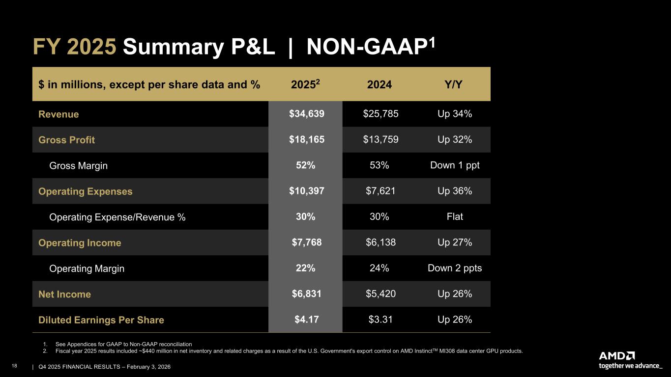 17 | | 2025年第四季度财务业绩– 2026年2月3日2025财年损益表摘要| GAAP百万美元,不包括每股数据和% 202512024年度收入34,639美元25,785美元增长34%毛利润17,152美元12,725美元增长35%毛利率50% 49%增长1个百分点营业费用13,458美元10,825美元增长24%营业费用/收入% 39% 42%下降3%营业收入3,694美元1,900美元增长94%营业利润率11% 7%增长4个百分点净收入4,335美元1,641美元增长164%稀释后每股收益2.65美元1.00美元增长165% 1。2025财年业绩包括约4.4亿美元的净库存和相关费用,这是由于美国政府对AMD InstinctTM MI308数据中心GPU产品实施出口管制。